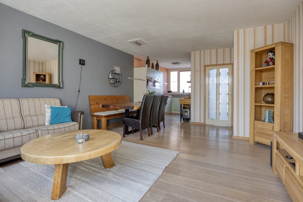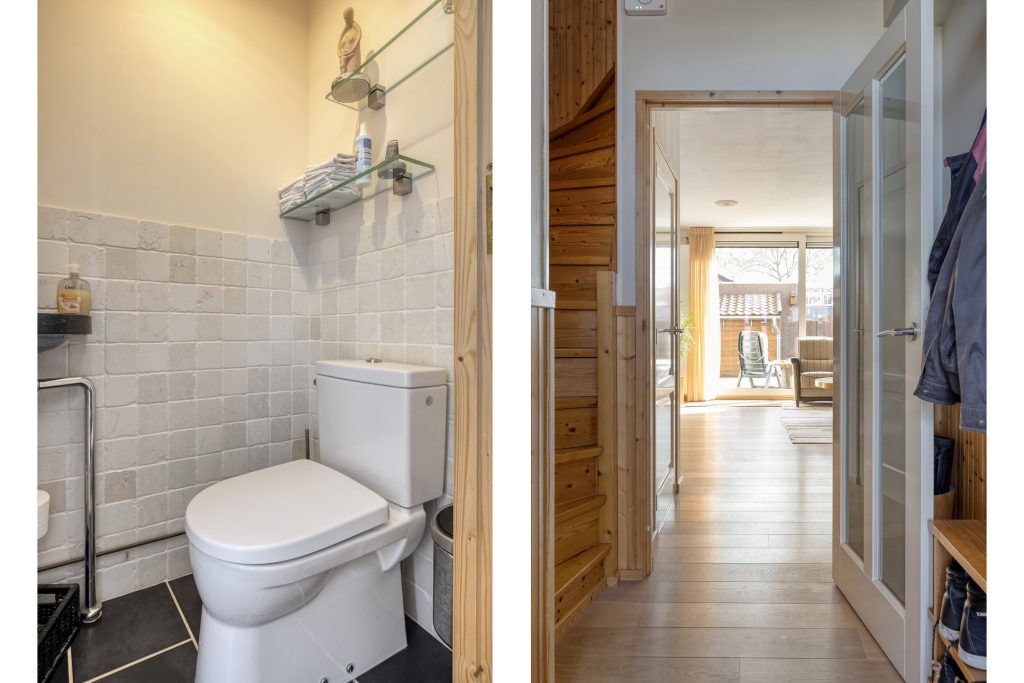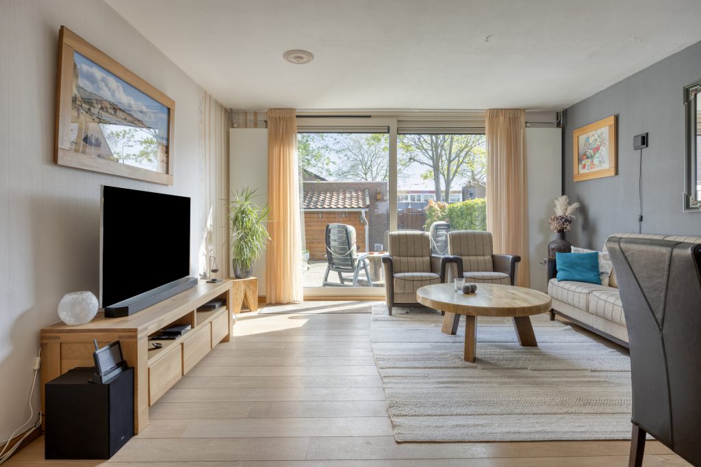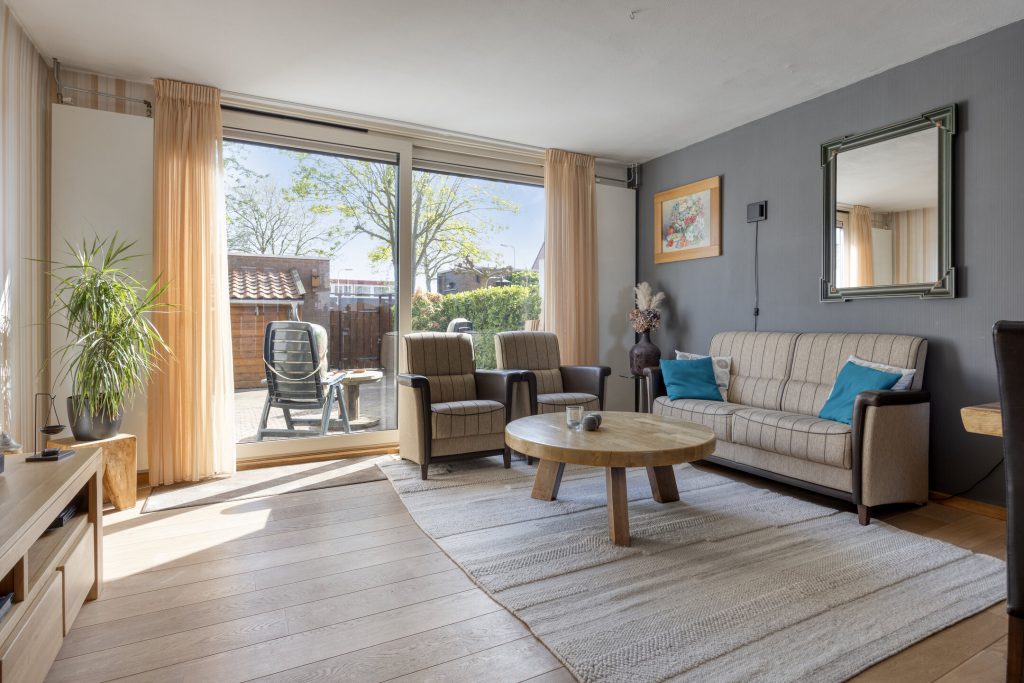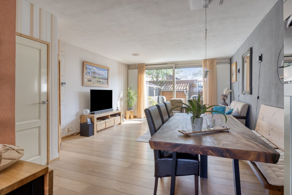 Bij aankomst ervaart u direct de rustige en prettige woonomgeving. Achter de voordeur schuilt een hal met separate toilet en meterkast, waarna u doorloopt naar de woonkamer. De woonkamer is licht en ruim opgezet, met een schuifpui naar de zonnige achtertuin en een houten vloer als basis. De praktische trapkast zorgt voor extra opbergruimte. Hier ziet u direct potentie: met een aantal eigentijdse aanpassingen creëert u hier een moderne en sfeervolle leefruimte die volledig aansluit bij uw woonwensen.