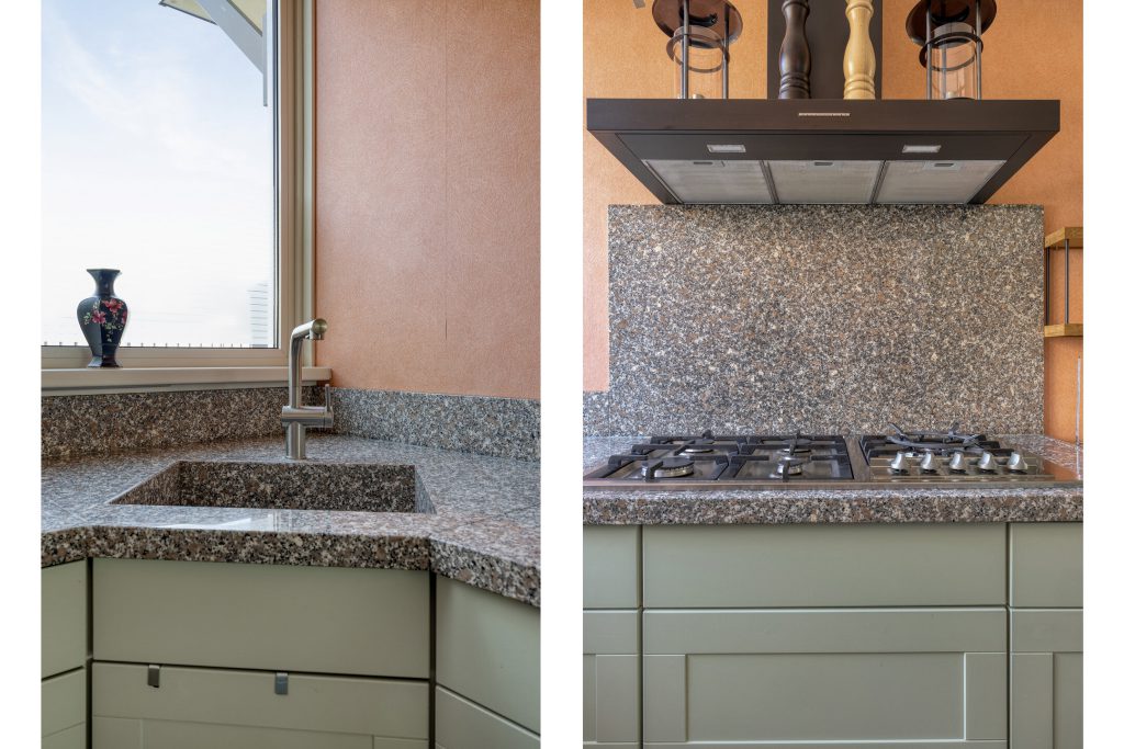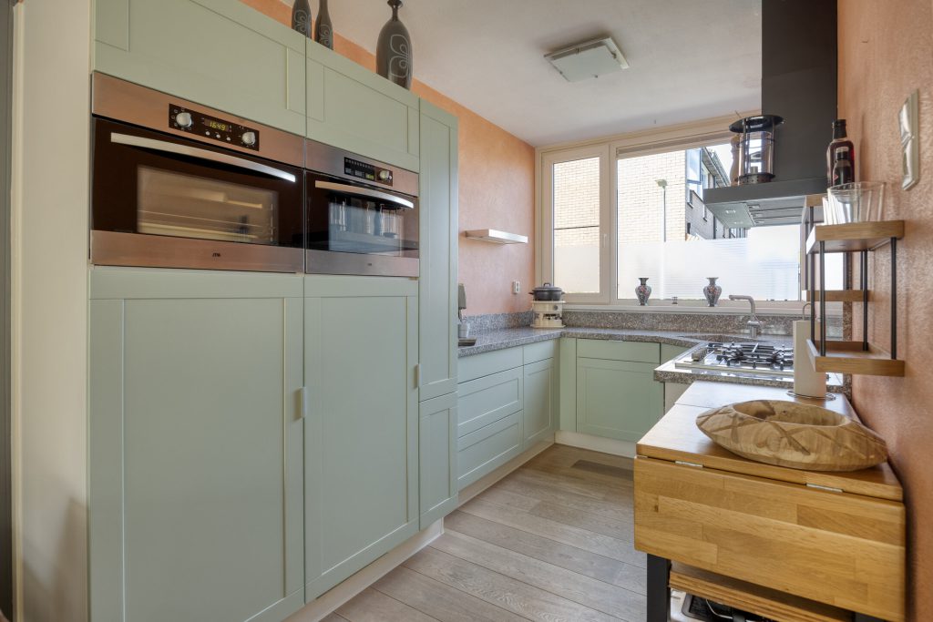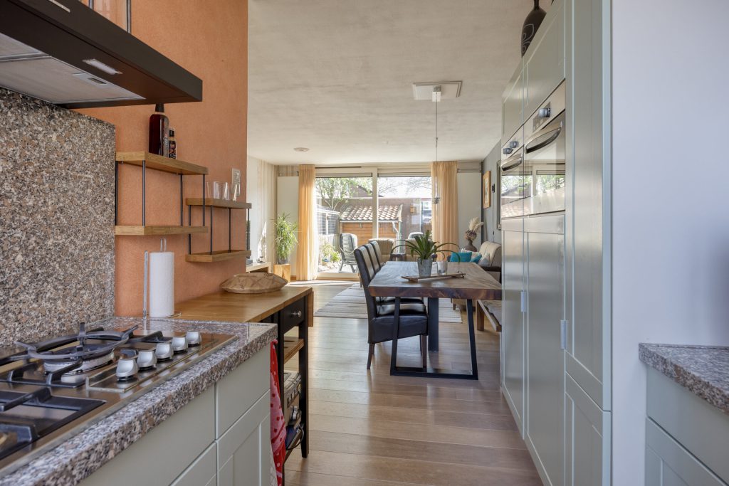 De moderne open keuken is praktisch ingericht en van alle gemakken voorzien. U kookt hier met gemak dankzij diverse inbouwapparatuur, waaronder een 5 pits kookplaat met wok brander, afzuigkap (2024), vriezer (2025), koelkast, combi-/oven magnetron en vaatwasser. Het natuurstenen werkblad geeft de keuken een luxe uitstraling, terwijl de opstelling ervoor zorgt dat u altijd betrokken blijft bij wat er in de woonkamer gebeurt.