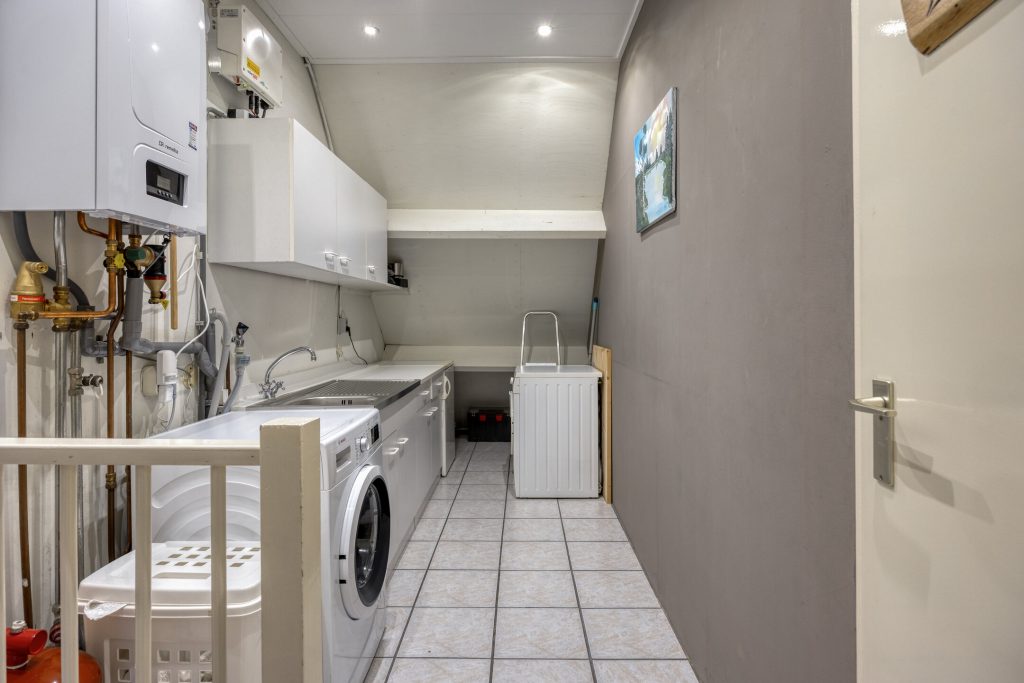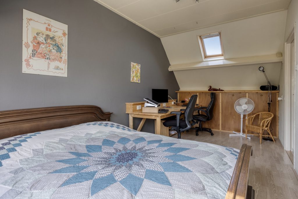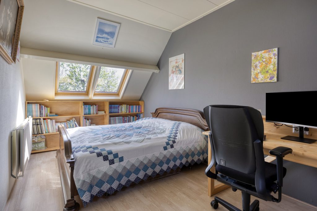De tweede verdieping verrast opnieuw. Op de voorzolder vindt u de opstelling voor de wasmachine en droger, de cv-ketel (2024) en een praktisch keukenblok. Ideaal om de was direct op te vouwen en alles netjes op te bergen. De extra slaapkamer is dankzij de dakramen een lichte en prettige ruimte. Achter de knieschotten en op de bergzolder heeft u bovendien meer dan voldoende opbergmogelijkheden.