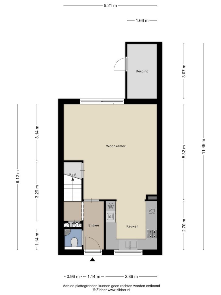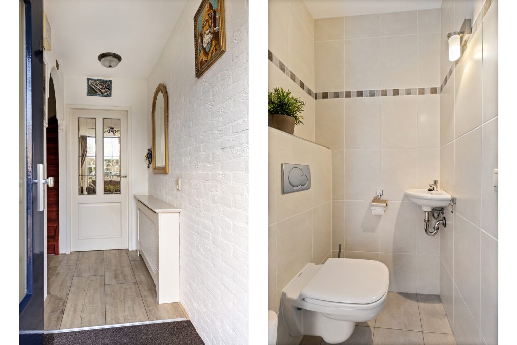 Via de voortuin betreedt u de woning. In de hal vindt u het aparte toilet met fonteintje, de meterkast en heeft u toegang tot de woonkamer.