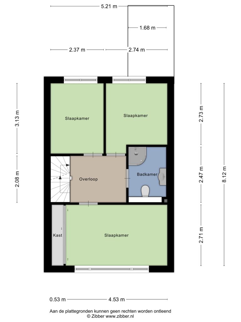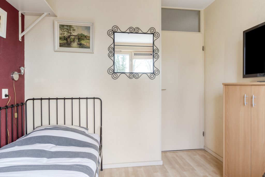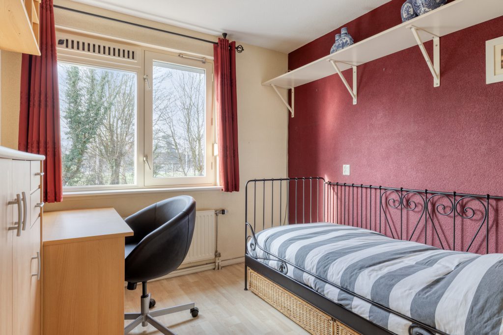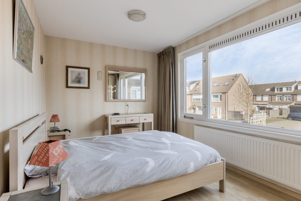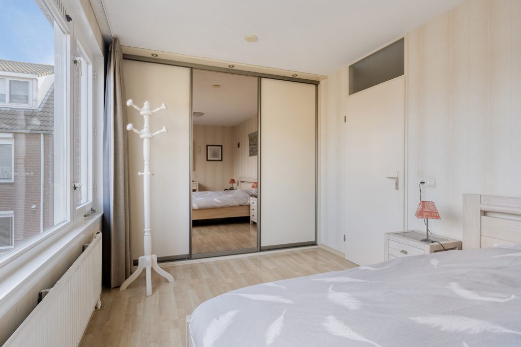 De ruime overloop is voorzien van een vloerbedekking en biedt toegang tot de slaapkamers en de badkamer. In de slaapkamers ligt een laminaatvloer. In de slaapkamer aan de voorzijde vindt u praktische inbouw- en schuifdeurkasten, die zorgen voor extra bergruimte.