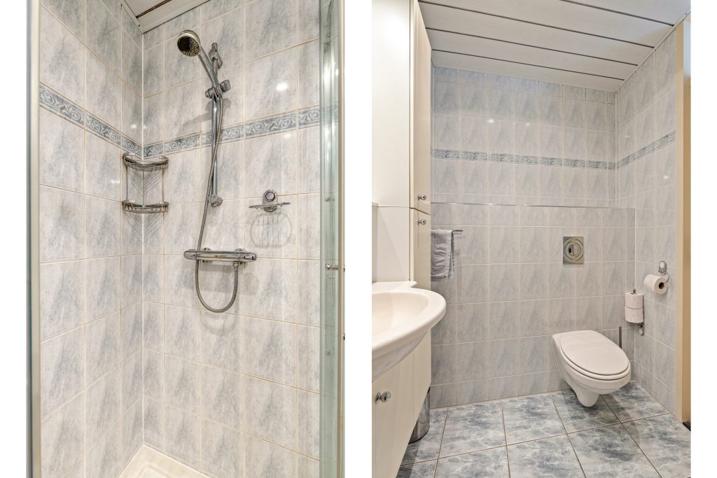 De badkamer is eenvoudig maar functioneel uitgevoerd en voorzien van een douchecabine, wastafel met meubel, spiegelverlichting en een tweede hangend toilet.