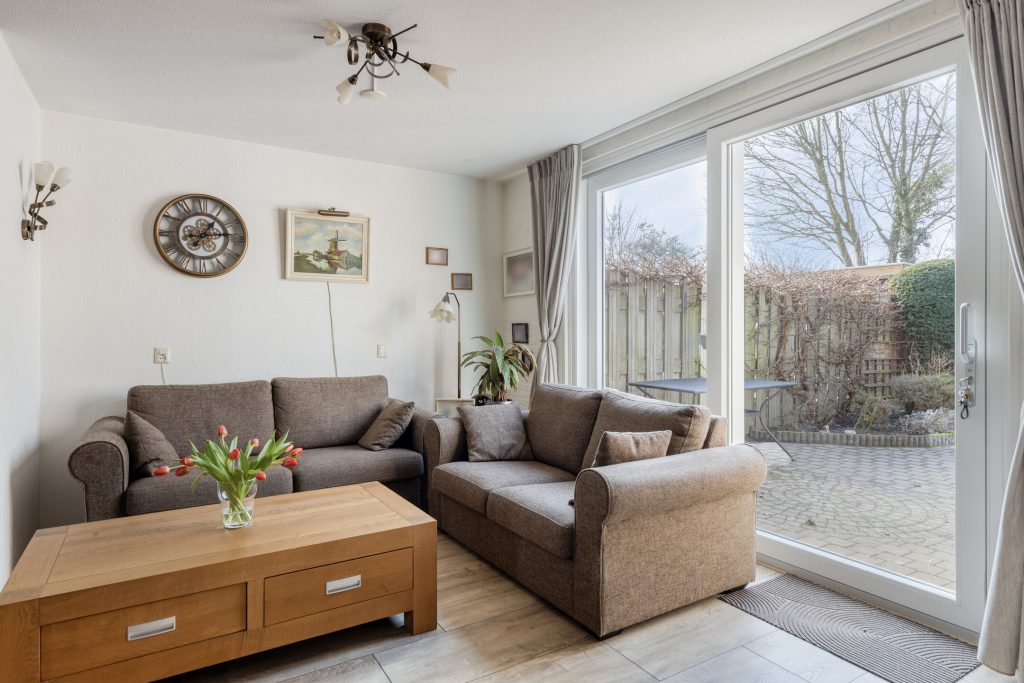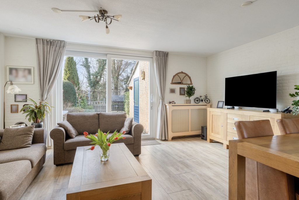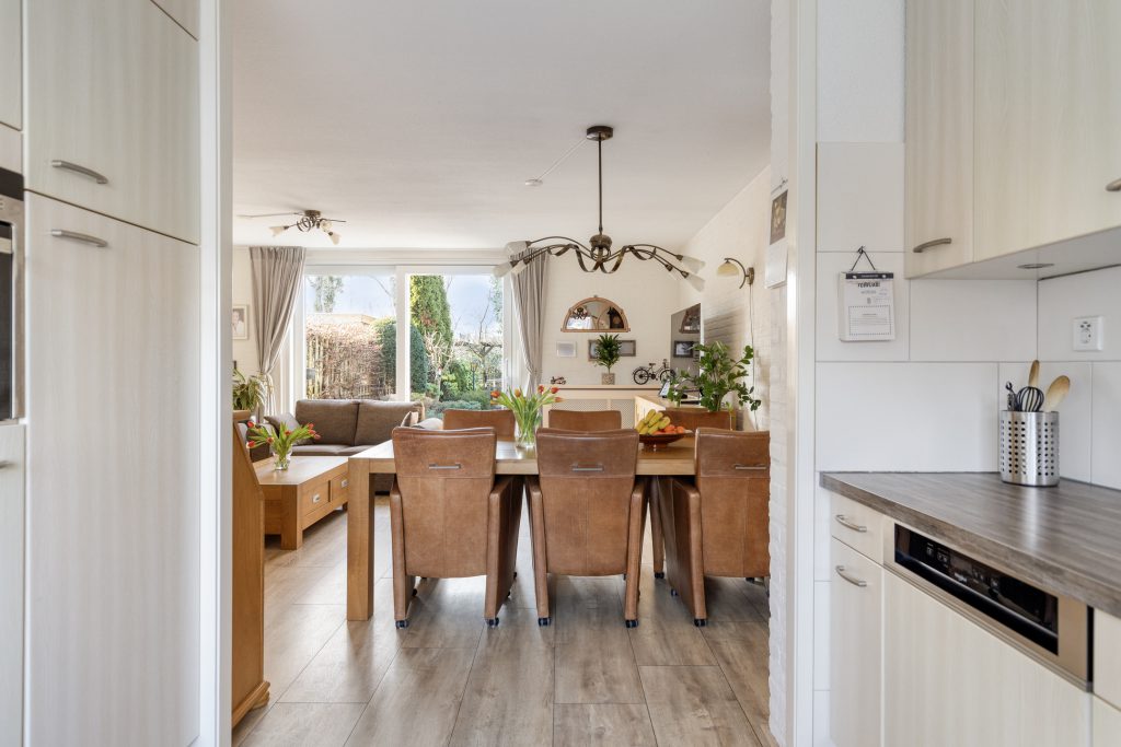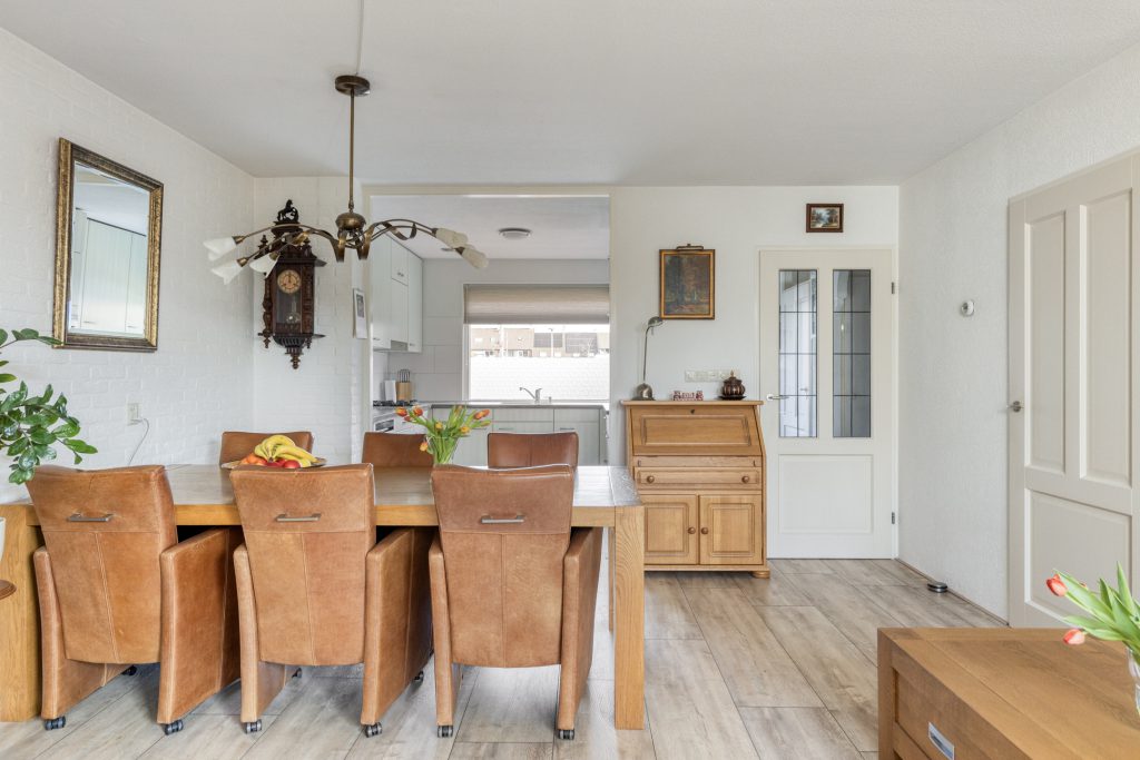 De woonkamer is een lichte en sfeervolle ruimte, voorzien van een laminaatvloer en wanden met structuur- en steenstripafwerking. De indeling biedt volop ruimte voor zowel een comfortabele zithoek als een ruime eethoek, waardoor dit een prettige leefruimte is voor het hele gezin. Vanuit de woonkamer loopt u via de kunststof achterpui (2022) direct de zonnige achtertuin in.