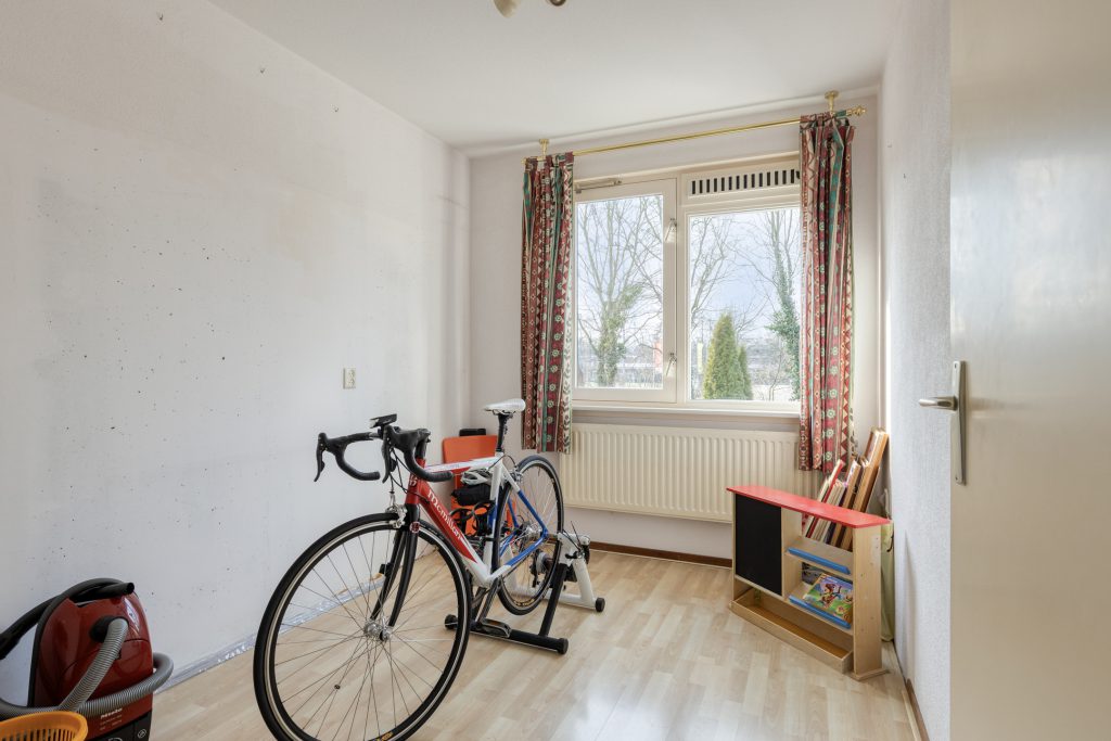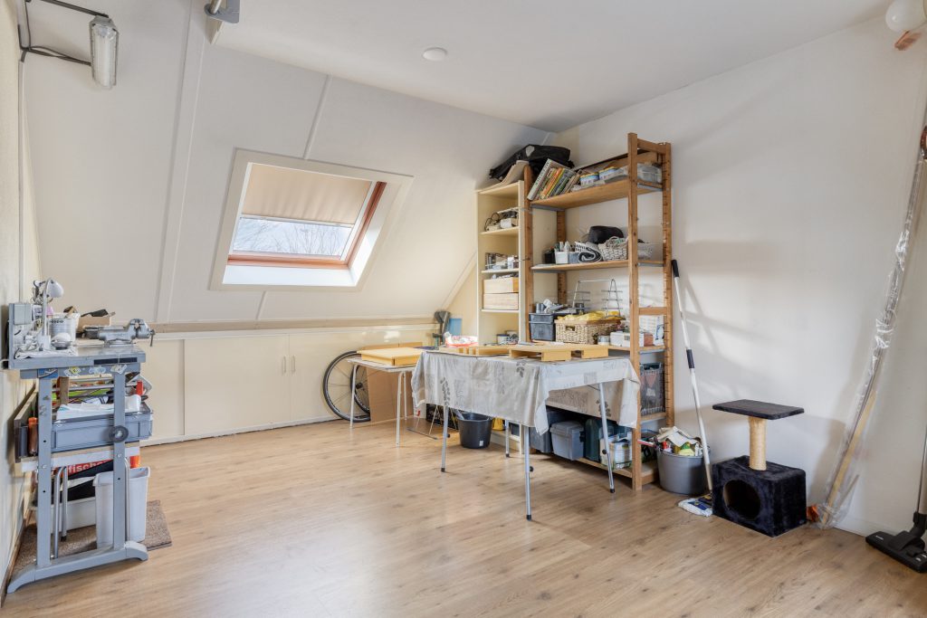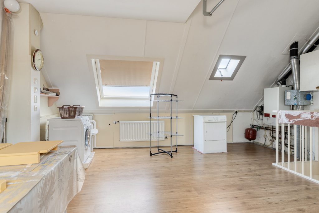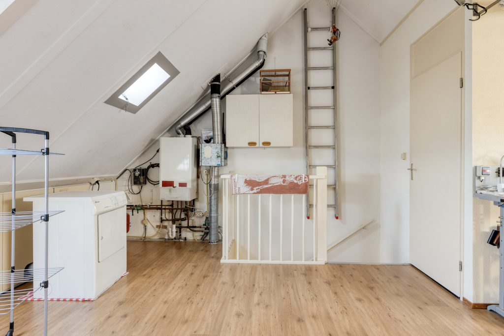 De tweede verdieping biedt verrassend veel ruimte en is voorzien van een laminaatvloer. Hier bevinden zich de cv-combiketel, de mechanische ventilatie-unit en de aansluitingen voor wasmachine en droger. Naast de bergruimte in de kast en achter de knieschotten is er bovendien een praktische vliering aanwezig, wat zorgt voor extra opbergmogelijkheden. Het tuimelraam zorgt voor natuurlijke lichtinval en ventilatie.
