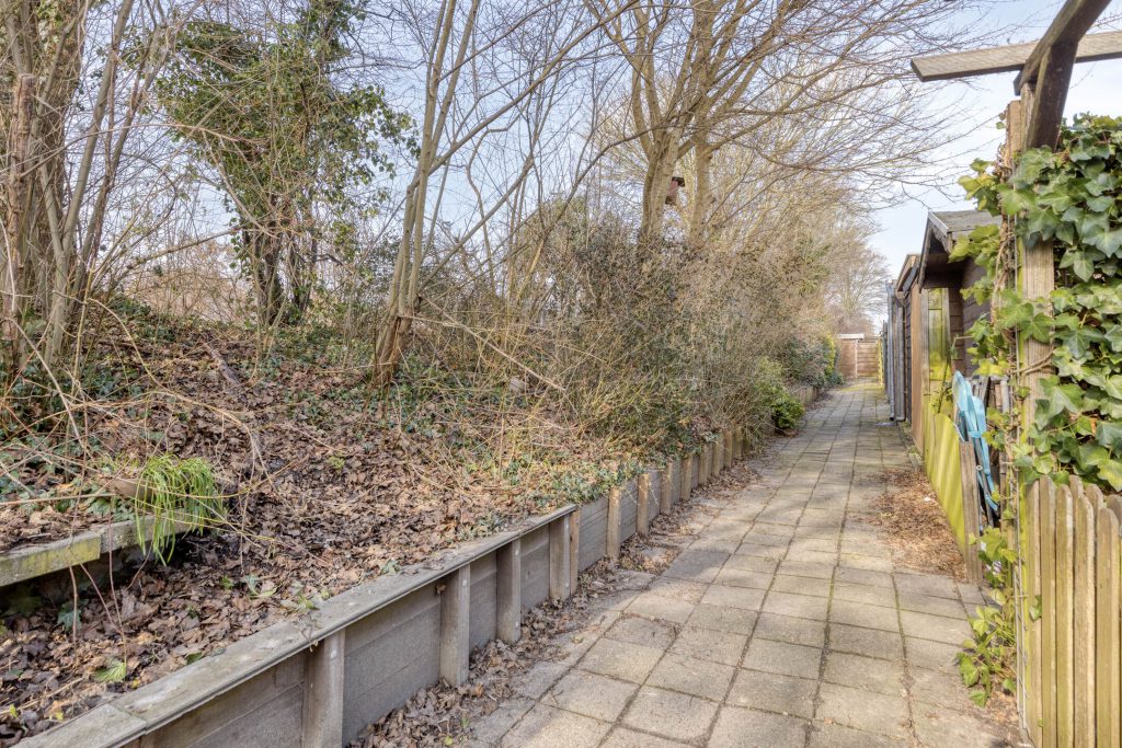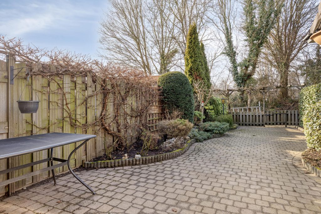 De achtertuin is onderhoudsvriendelijk aangelegd en beschikt over een stenen berging met elektra aansluiting, ideaal voor het stallen van fietsen en het opbergen van tuinbenodigdheden. De achtertuin biedt zowel zon als schaduw op zonnige dagen en de bomen op de geluidswal geven een prettig, bosrijk gevoel. Het elektrische zonnescherm zorgt voor extra comfort op zonnige dagen. Een fijne plek om in alle rust van het buitenleven te genieten.