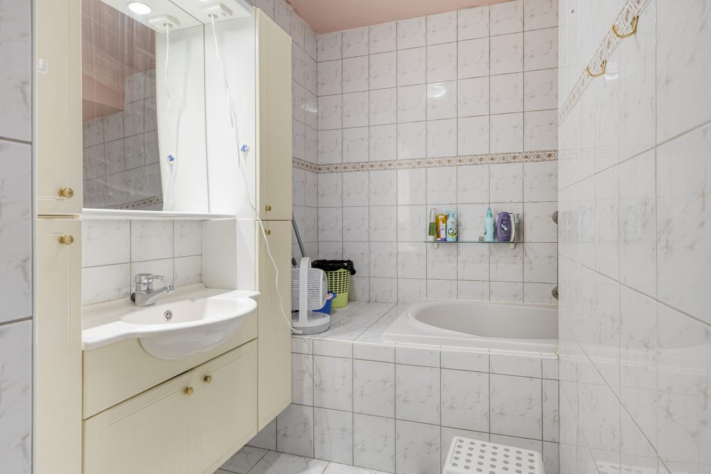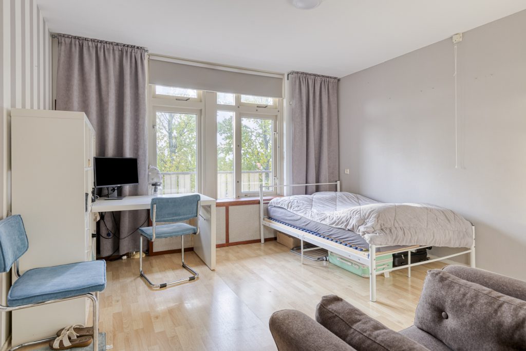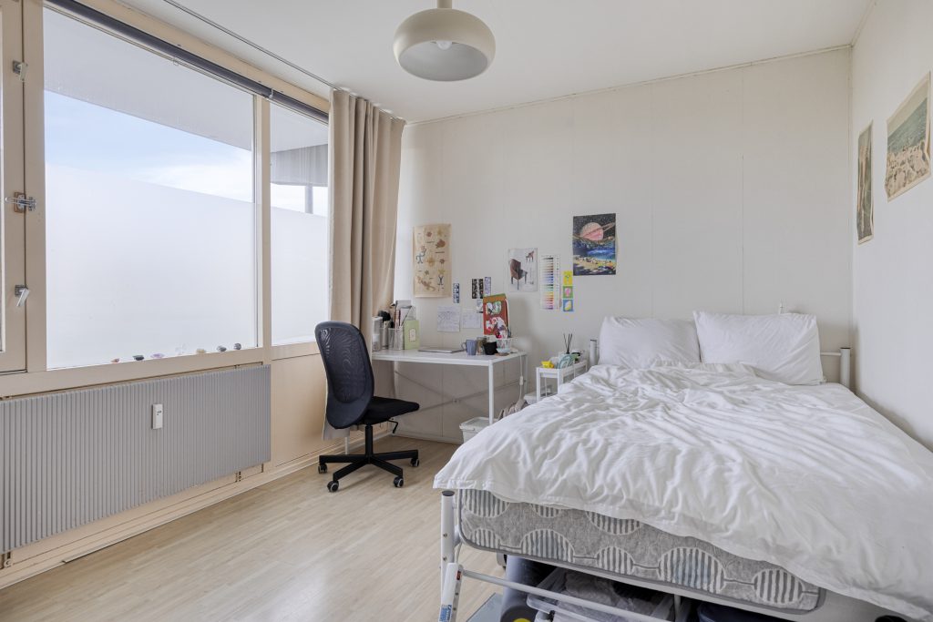 Het appartement beschikt over twee slaapkamers, beide voorzien van een laminaatvloer en grote raampartijen die zorgen voor veel daglicht. De badkamer is eenvoudig uitgevoerd en voorzien van een ligbad en een wastafel met meubel.