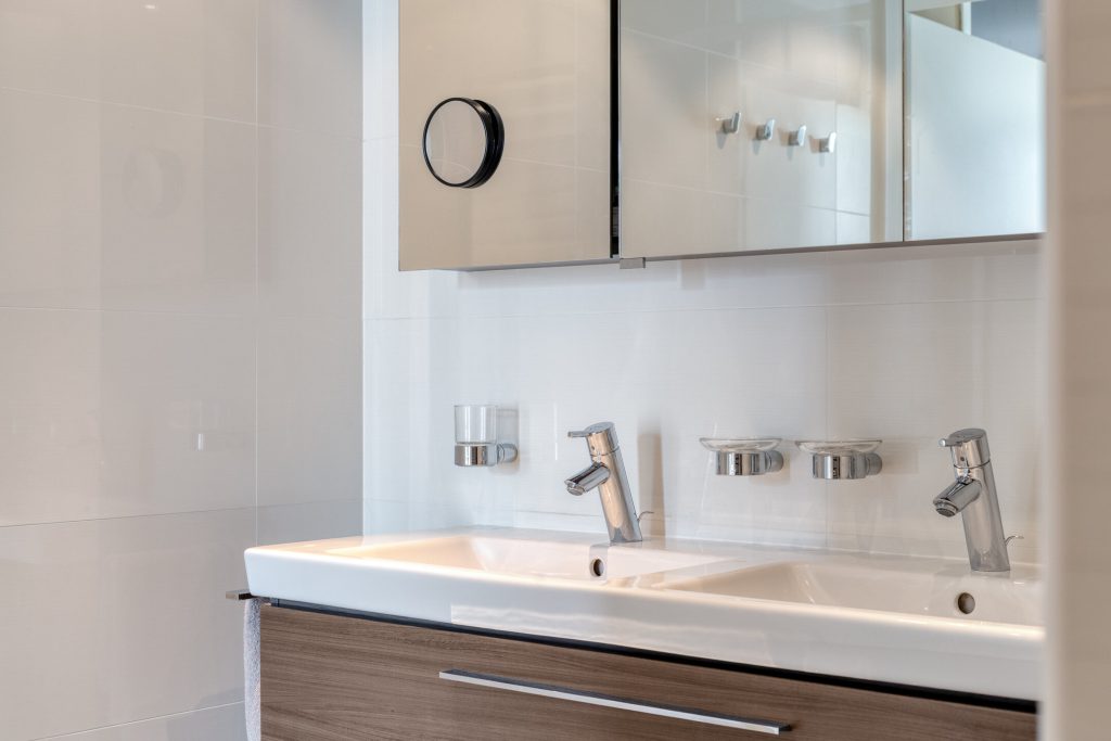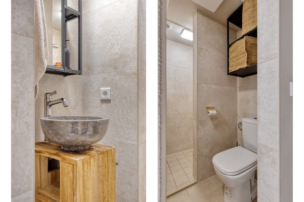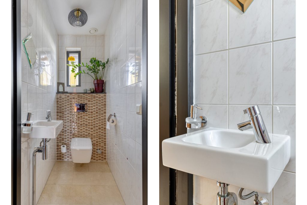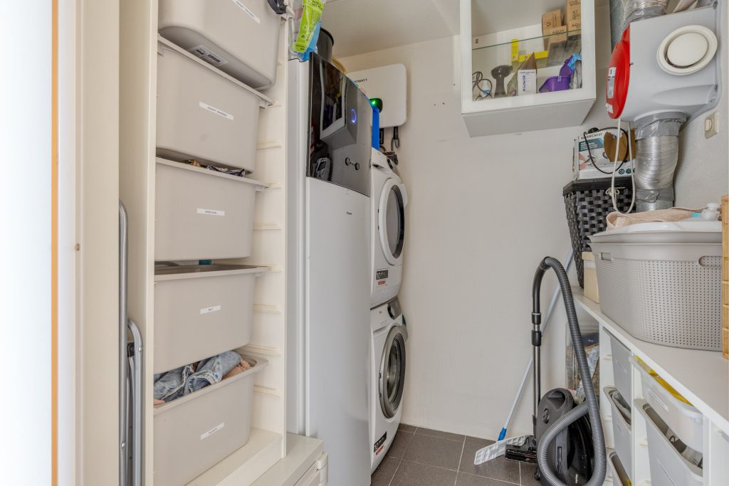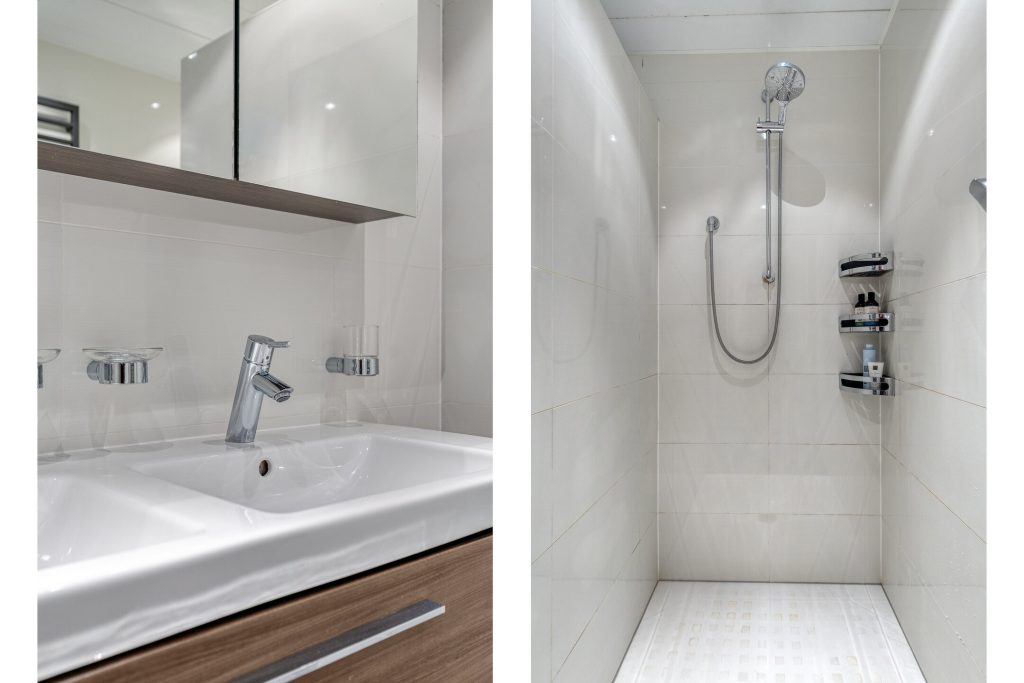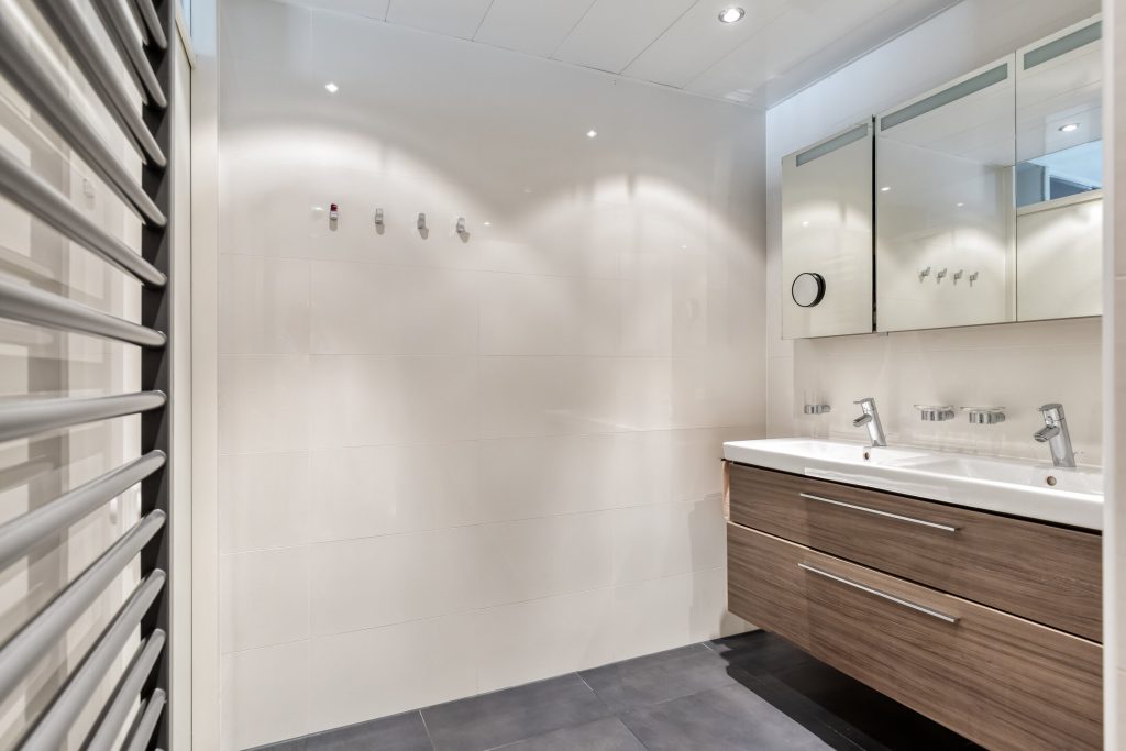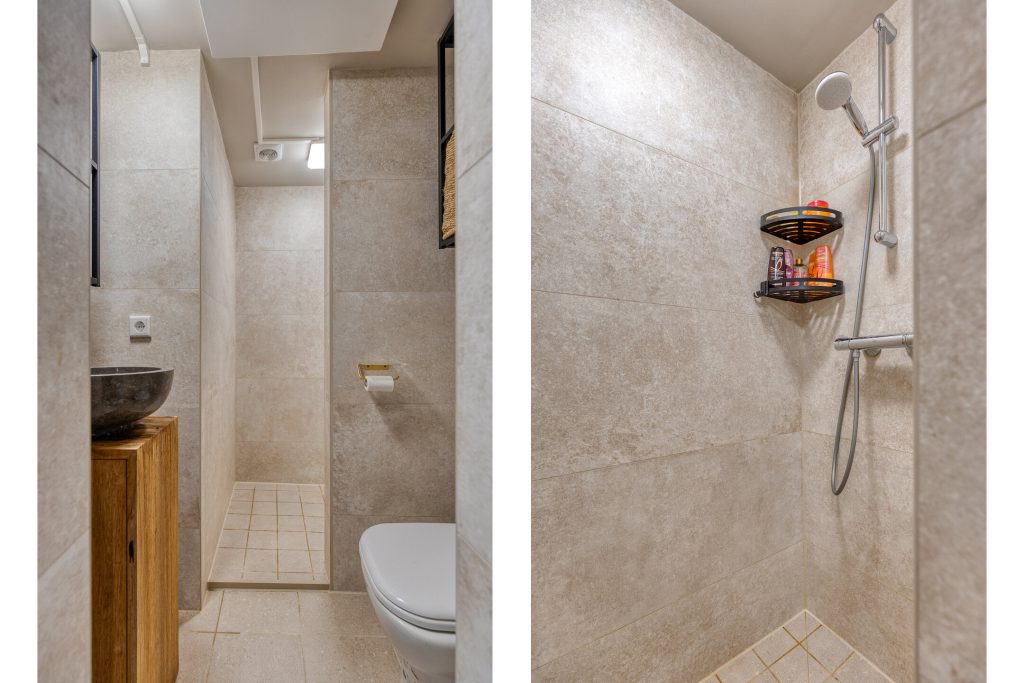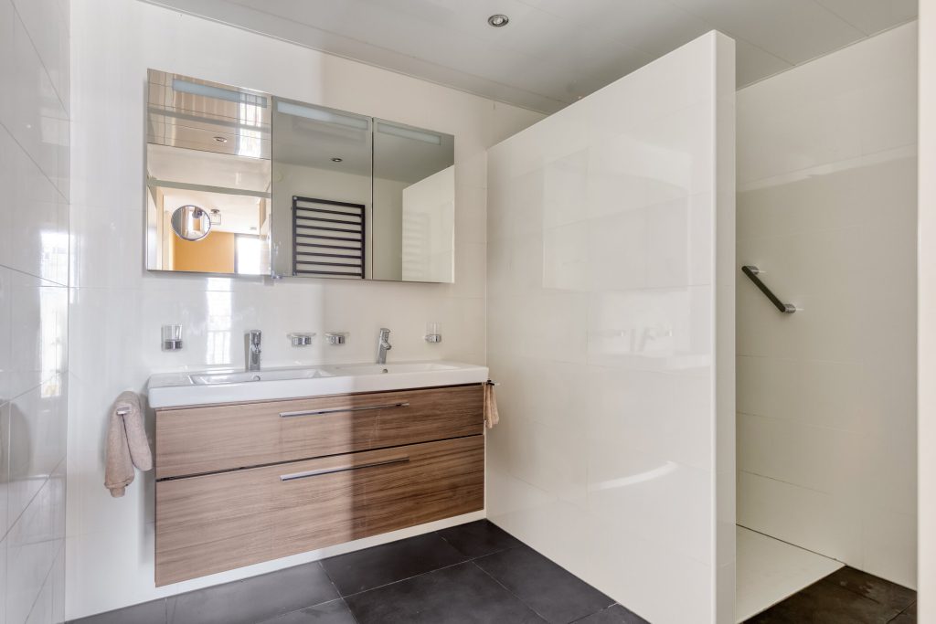 De moderne badkamer is uitgerust met een dubbele wastafel met spiegelverlichting, ruime inloopdouche met handdouche en designradiator. Op de overloop bevindt zich een separaat toilet met fonteintje en een technische ruimte met wasvoorziening, extra meterkast en warmtepomp (Daikin Altherma 3 RF, 2023).