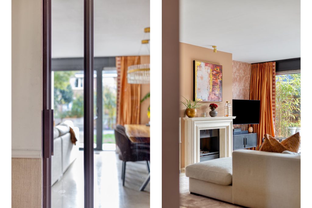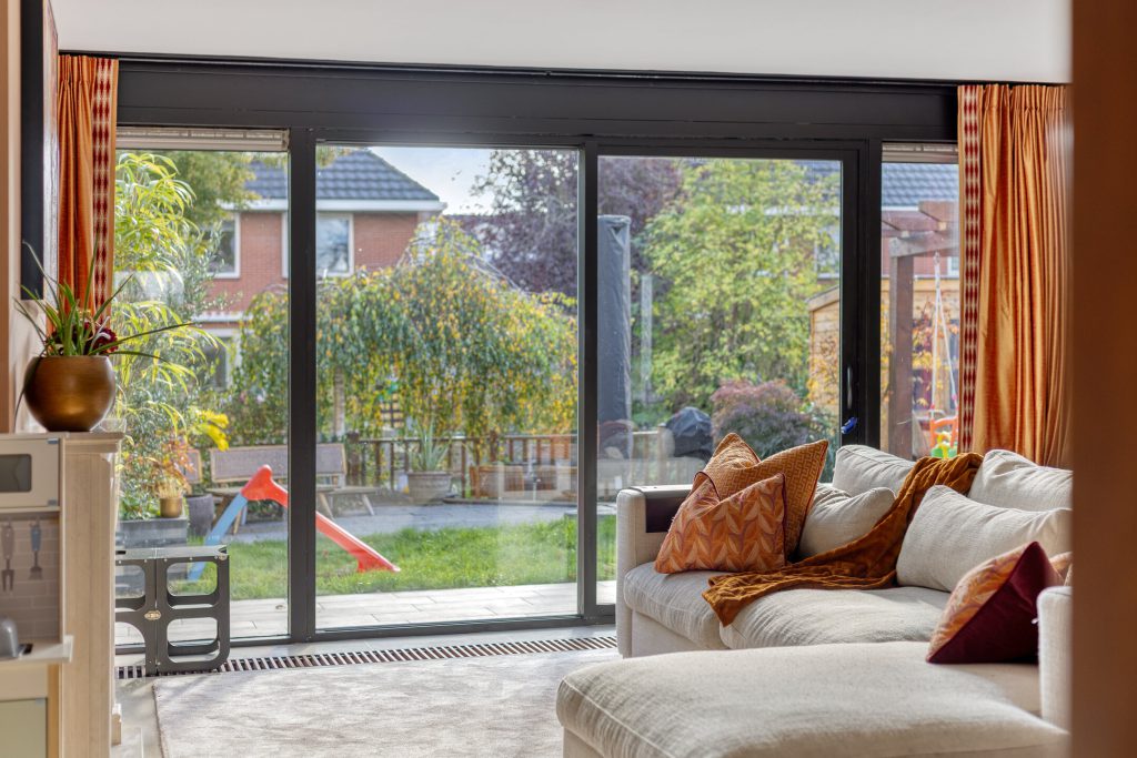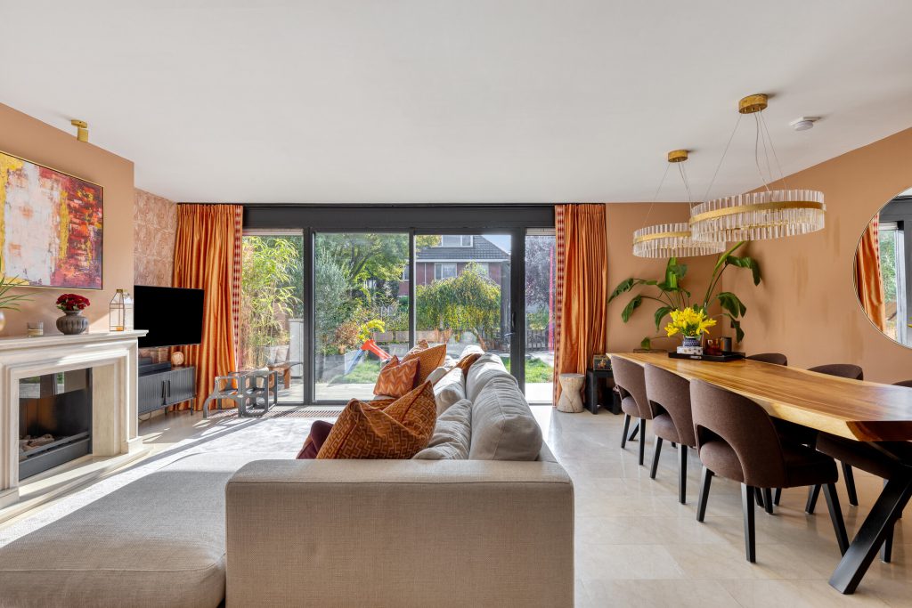 – Woonkamer met vloerverwarming, schuifpui en sfeervolle schouw;
