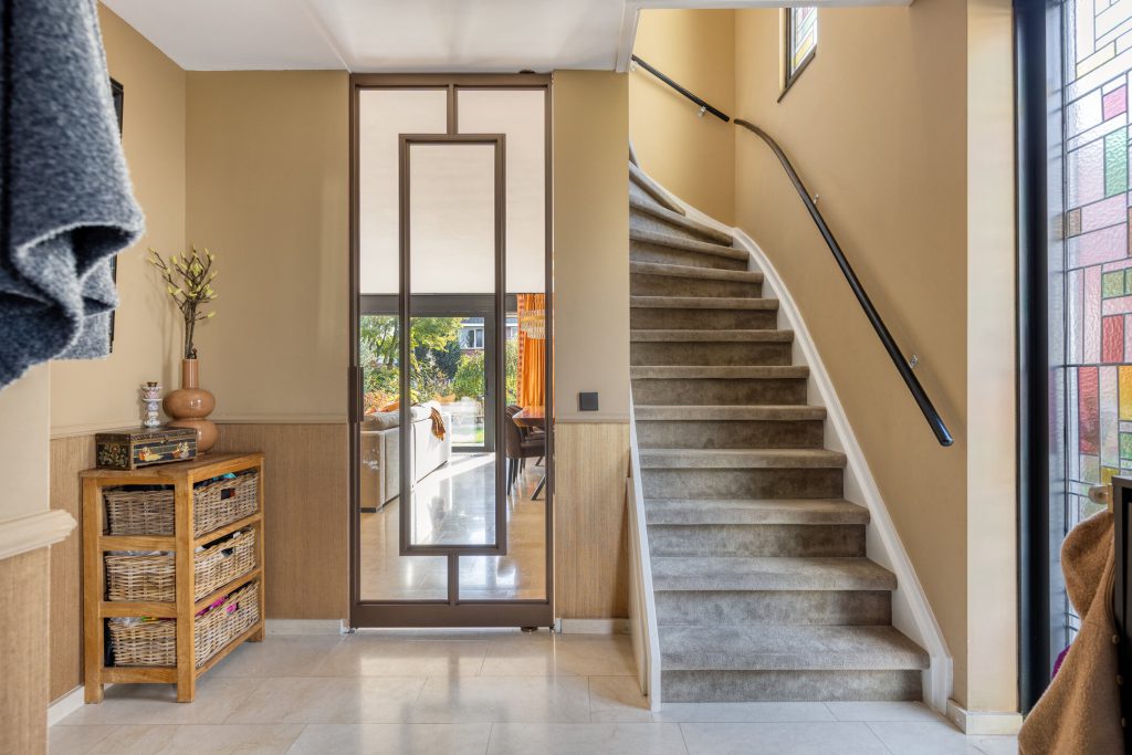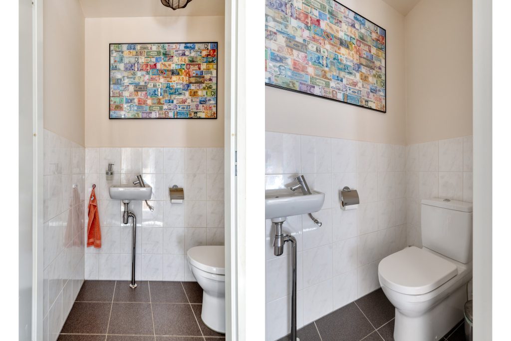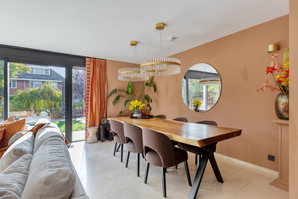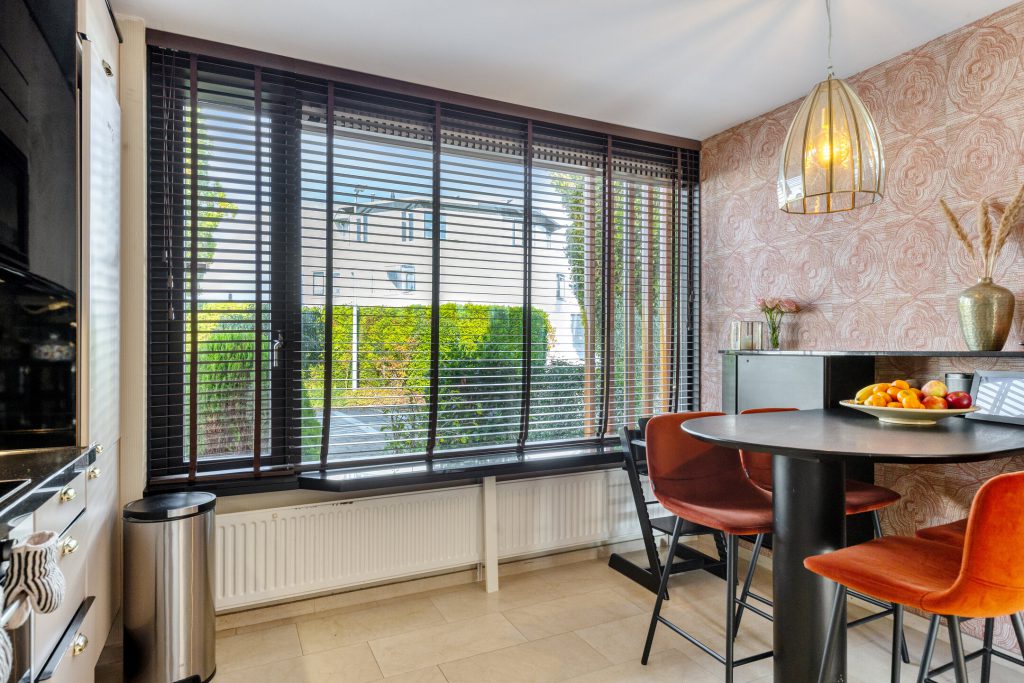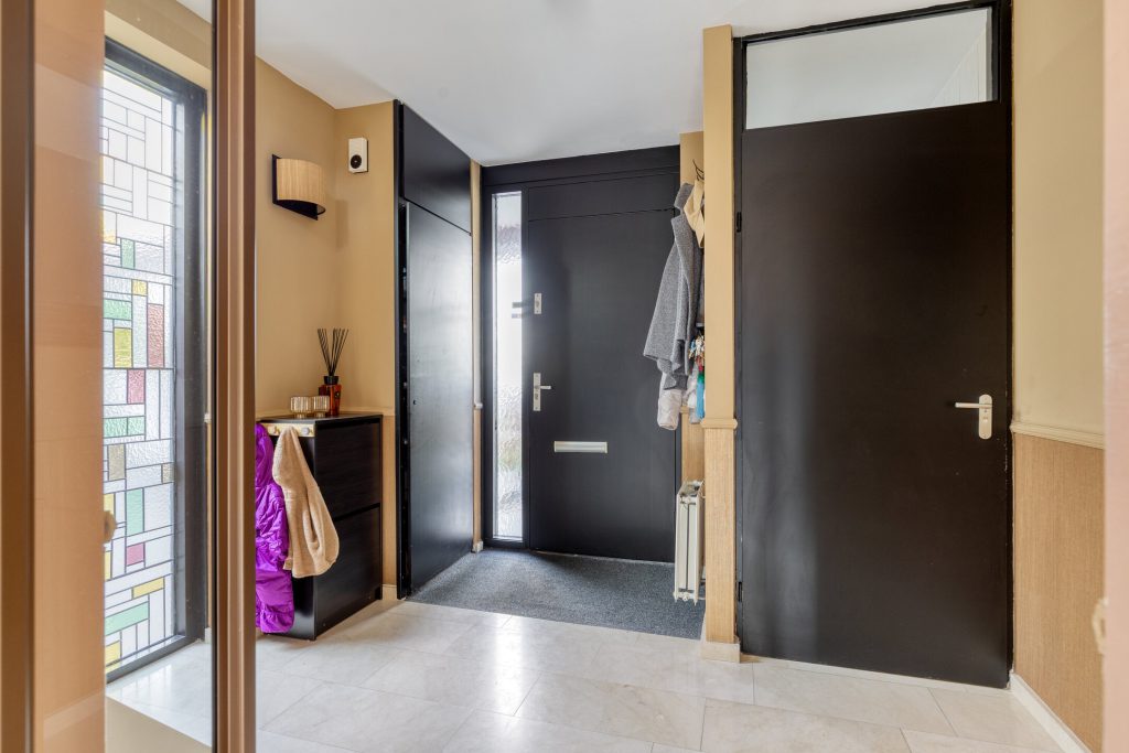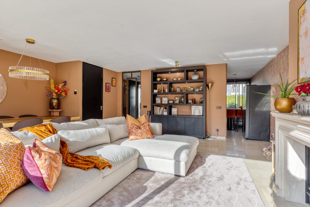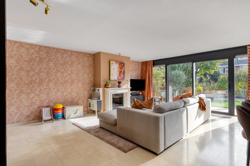 Via de verzorgde hal met modern toilet en fraaie glas-in-loodramen bereikt u de ruime woonkamer. De grote schuifpui zorgt voor veel lichtinval en een directe verbinding met de tuin. De afwerking is eigentijds met gestucte wanden, Spaans marmeren vloer met vloerverwarming en een stijlvolle taatsdeur in koperkleur (De Rooy). Een gezellige zithoek bij de gashaard met klassieke schouw biedt in de winter een comfortabele plek om te ontspannen.