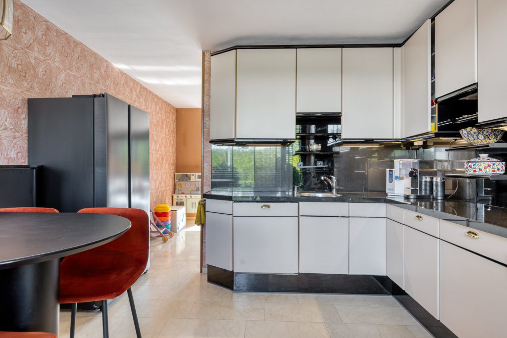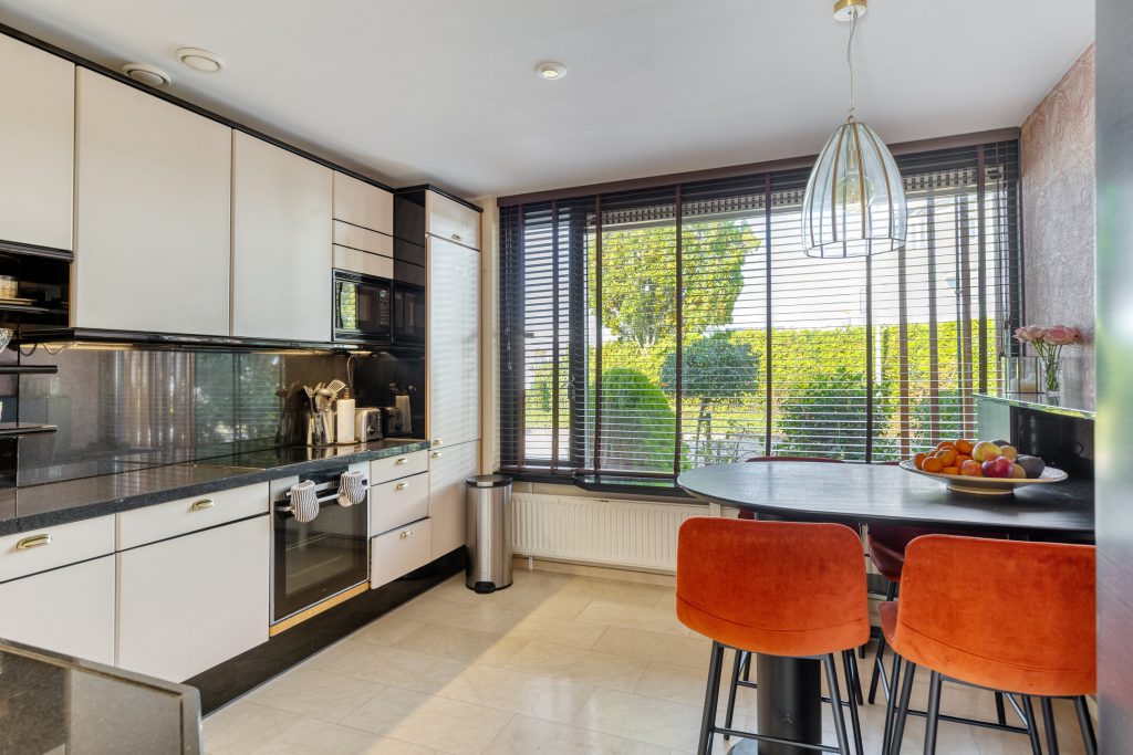De open keuken is voorzien van diverse inbouwapparatuur waaronder een inductiekookplaat, afzuigkap, vaatwasser, oven/magnetroncombinatie en een vaste tafel.