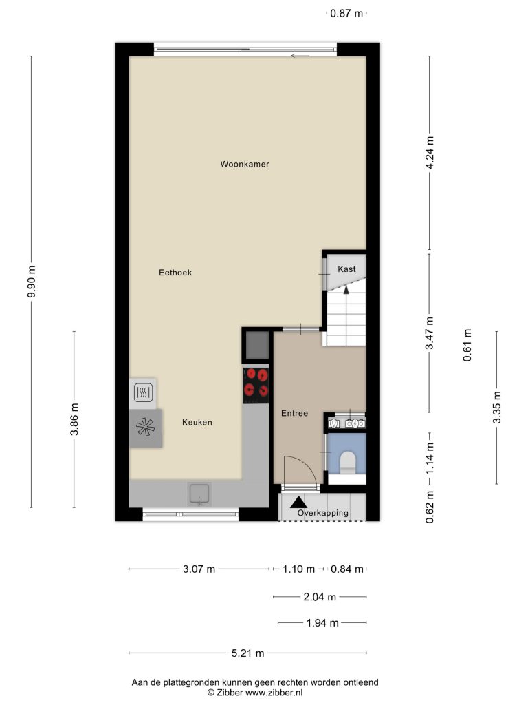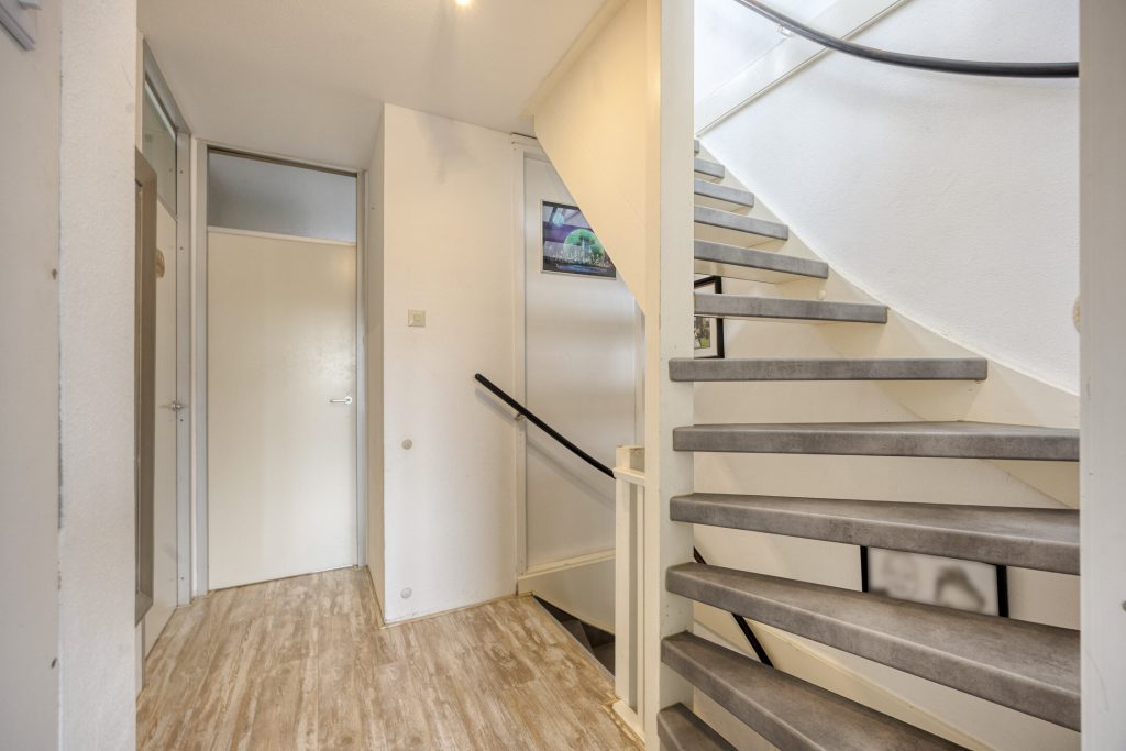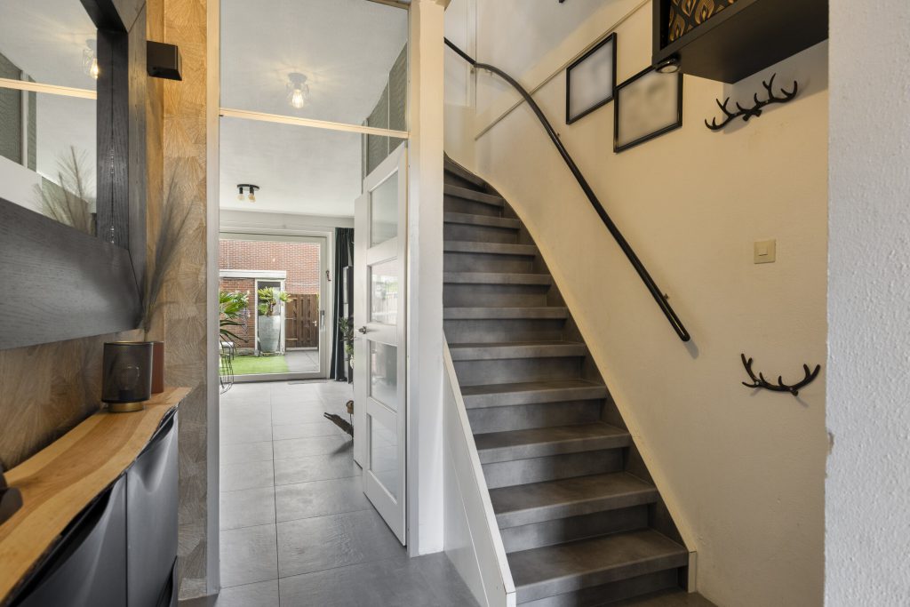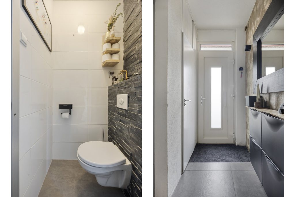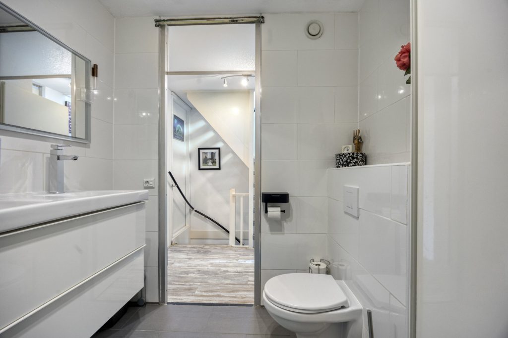 Bij binnenkomst treft u een nette hal met hangend toilet, trapopgang met verlichting en een meterkast met 8 groepen en 2 aardlekschakelaars.