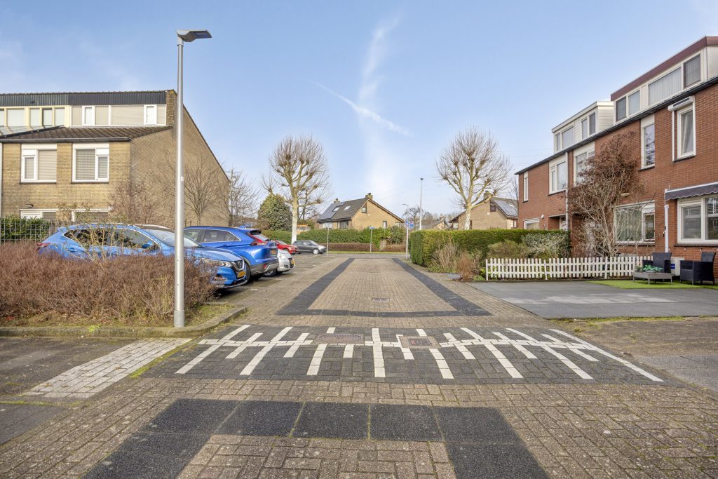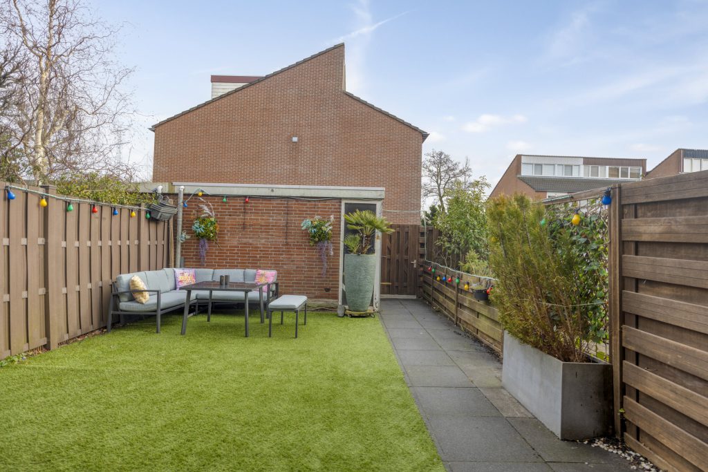De voortuin ligt op het noordwesten en beschikt over elektra, en er is een eigen oprit waar twee auto’s geparkeerd kunnen worden. De zonnige achtertuin op het zuidoosten is praktisch ingericht met een achterom, wateraansluiting, zonwering en een vrijstaande stenen berging. De plek om te ontspannen op een warme zomerdag.