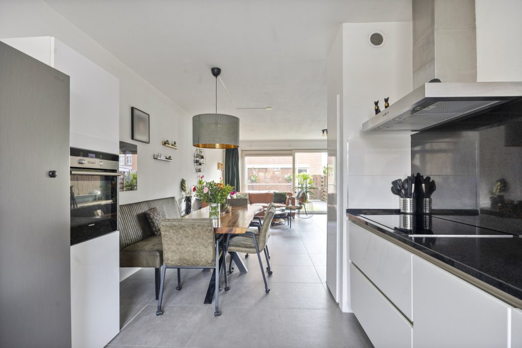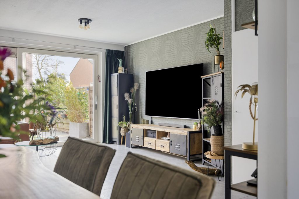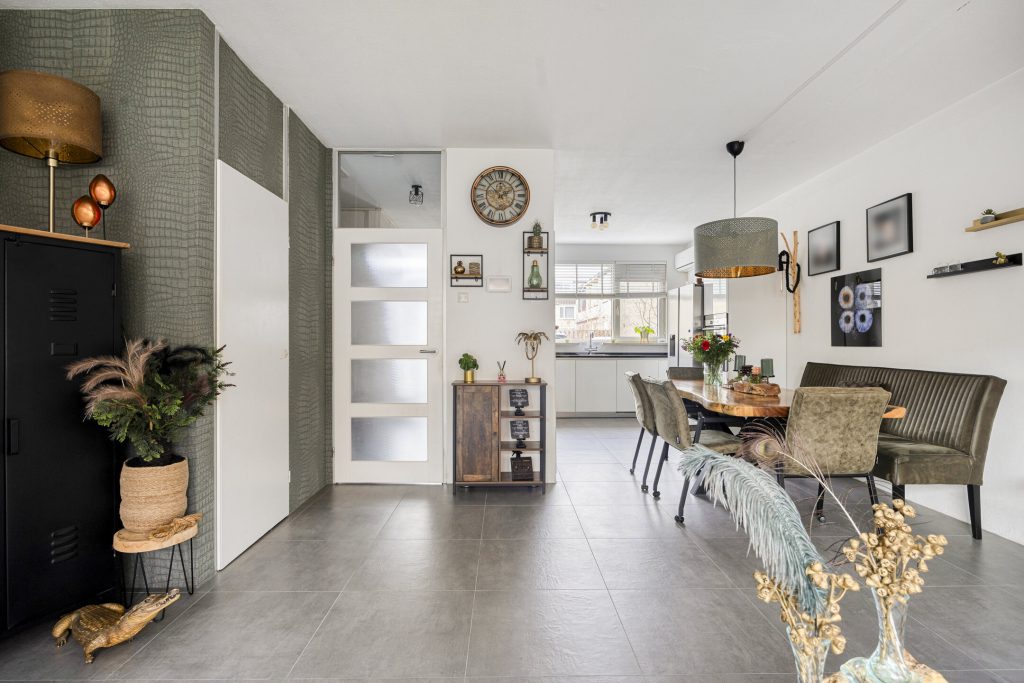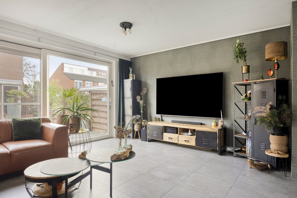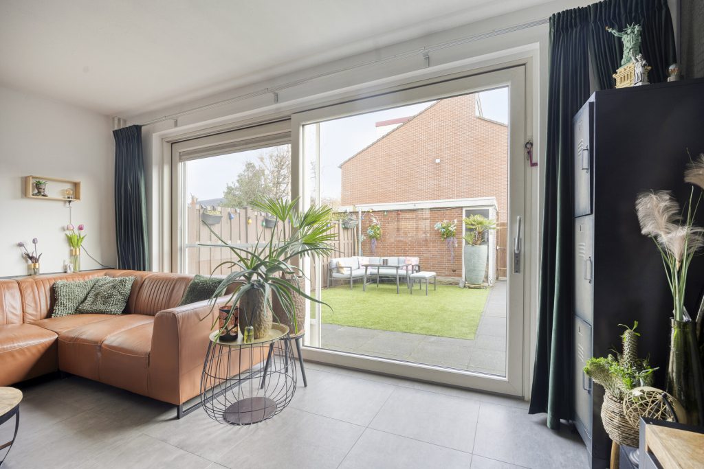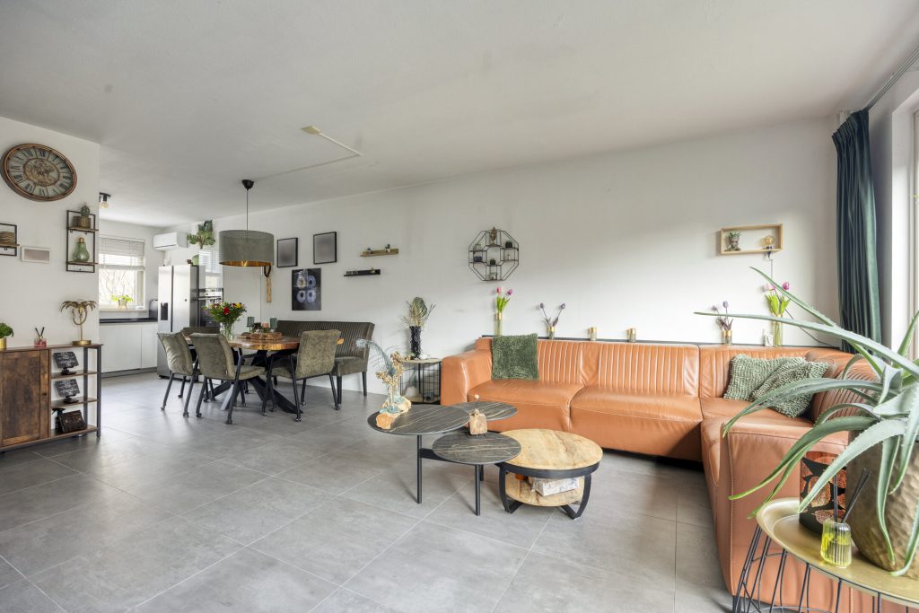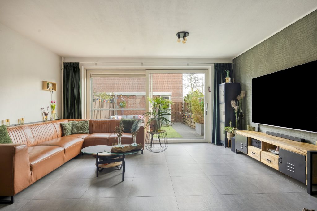 De woonkamer is ruim en licht, afgewerkt met een plavuizen vloer met vloerverwarming. Via de schuifpui loopt u direct de achtertuin in, waardoor binnen en buiten naadloos in elkaar overlopen. Daarnaast biedt de trapkast extra bergruimte, mede dankzij de geplaatste inzetkast.