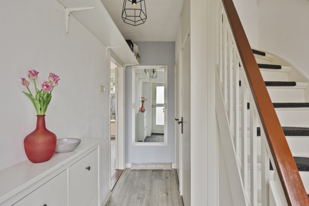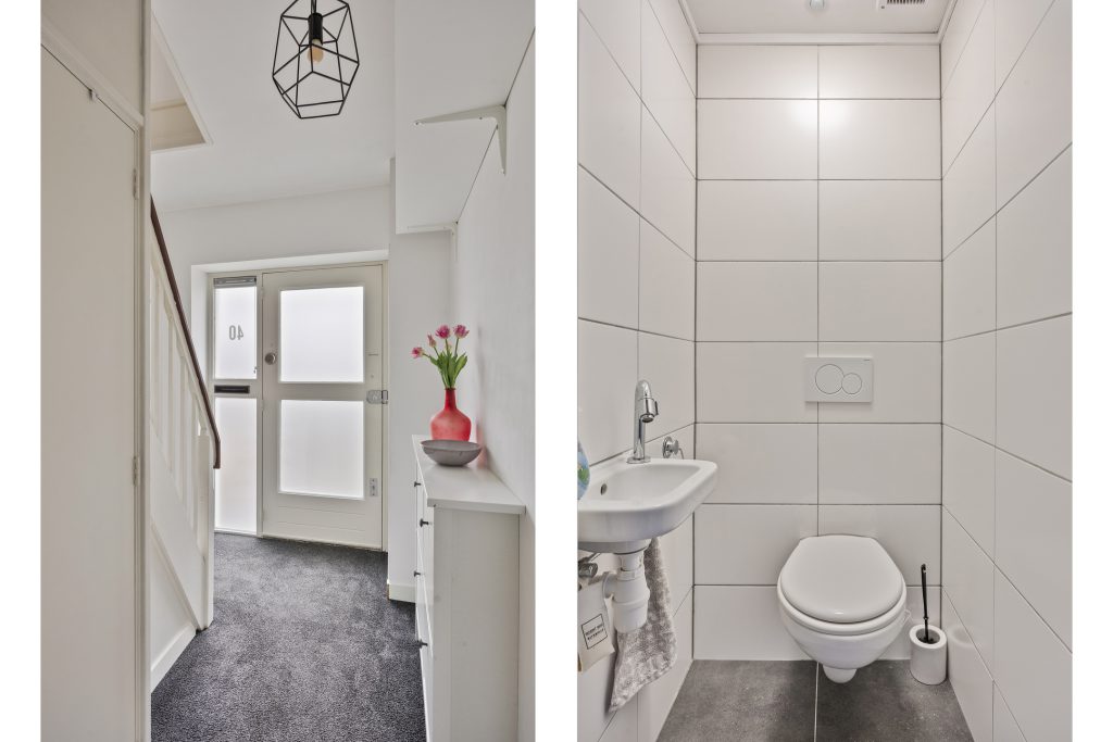 Via de ruime voortuin bereikt u de entree met overkapping. In de hal vindt u de trap naar de eerste verdieping, de meterkast, een trapkast en het toilet, dat is uitgevoerd in een lichte kleurstelling en voorzien van een zwevend closet en fonteintje.