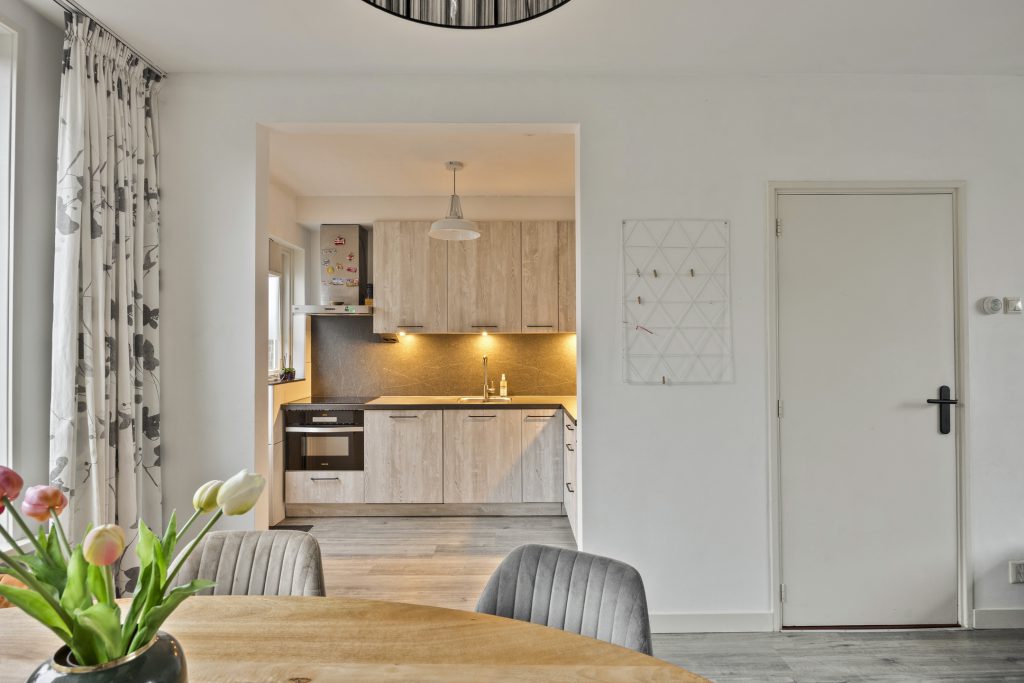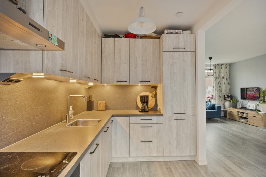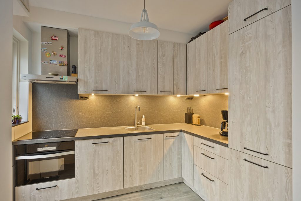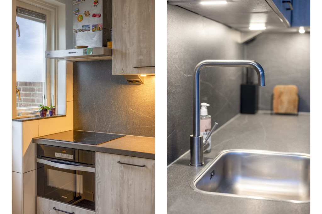 De open keuken is aan de achterzijde, opgesteld in een L-vorm met lichte frontjes en een donker blad. Voorzien van een 4-pits inductiekookplaat, koel-/vriescombinatie, afzuigkap, combi-oven, vaatwasser en close-in boiler. Hier is de deur naar de achtertuin, makkelijk met een kop koffie naar buiten en genieten van de zon.