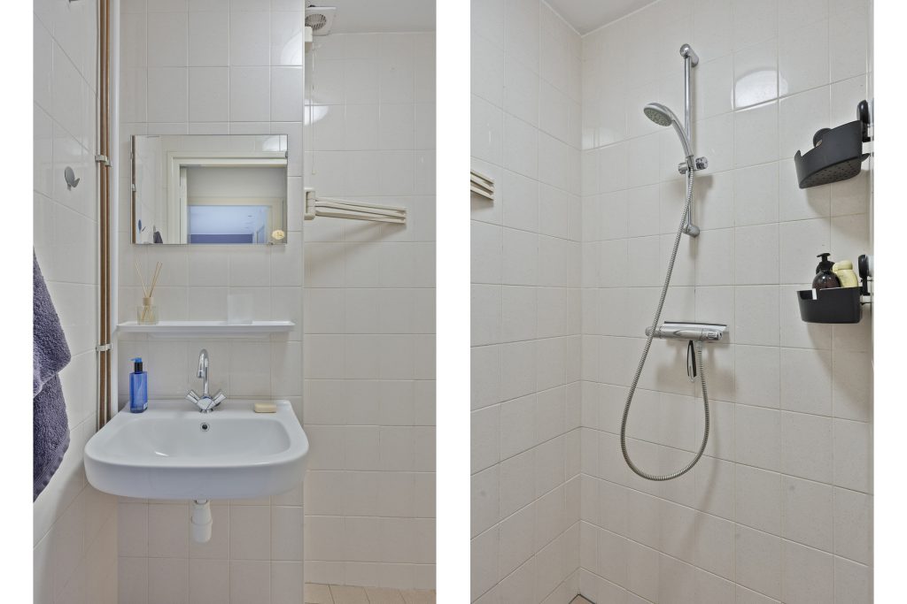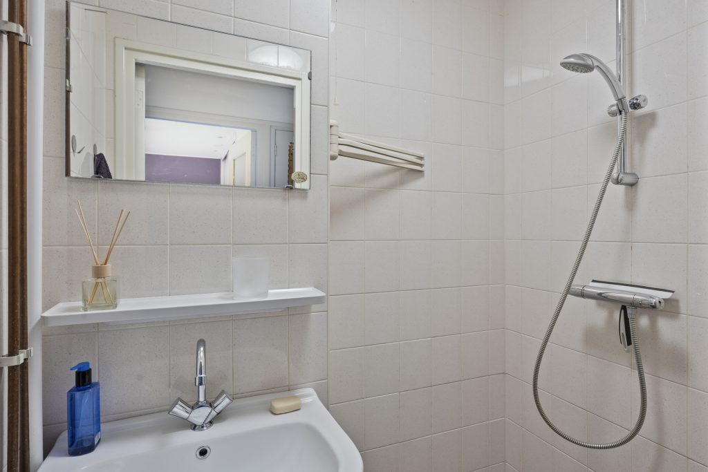 De badkamer is volledig betegeld en uitgerust met een wastafel met spiegel en een douche met handdouche.
