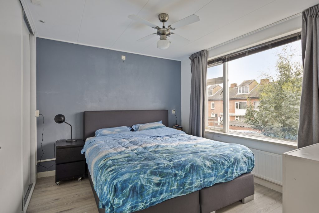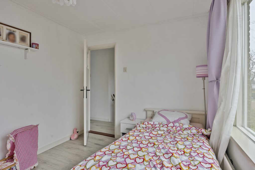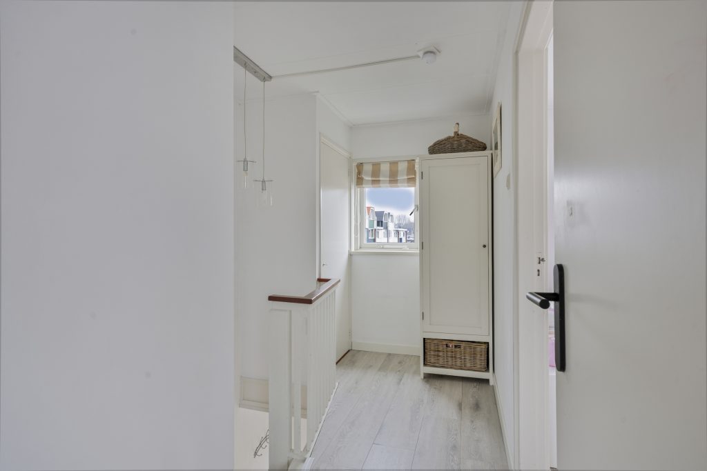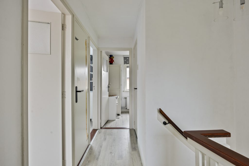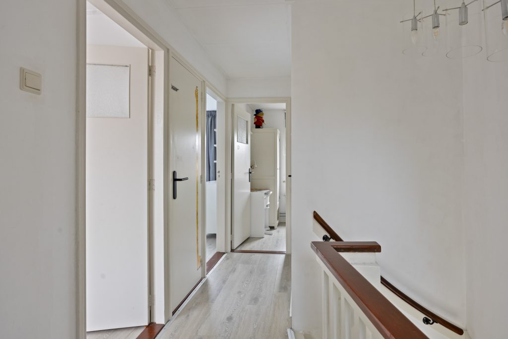 De overloop biedt toegang tot drie slaapkamers, de badkamer en een vaste kast met aansluitingen voor de wasmachine. Twee slaapkamers bevinden zich aan de achterzijde en zijn voorzien van een laminaatvloer en gestucte wanden. De grootste kamer beschikt over een schuifdeurkastenwand. De derde slaapkamer ligt aan de voorzijde en heeft eveneens een laminaatvloer en gestucte wanden.