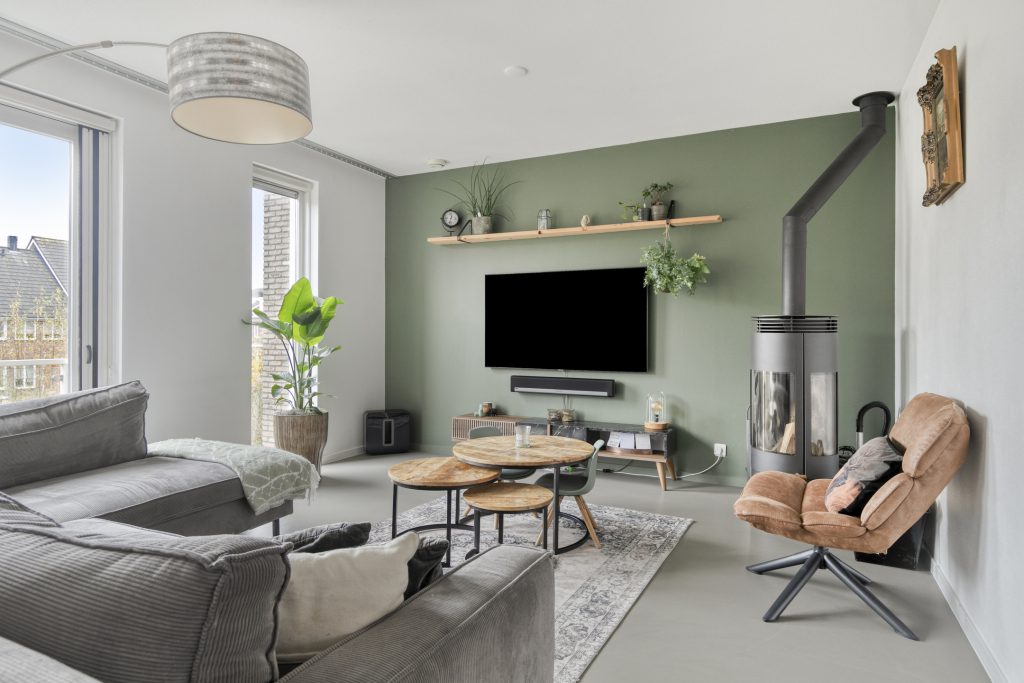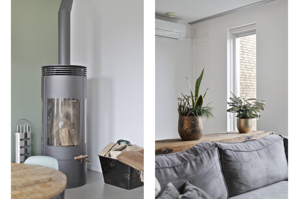 – Woonkamer met vloerverwarming, houtkachel en airco;