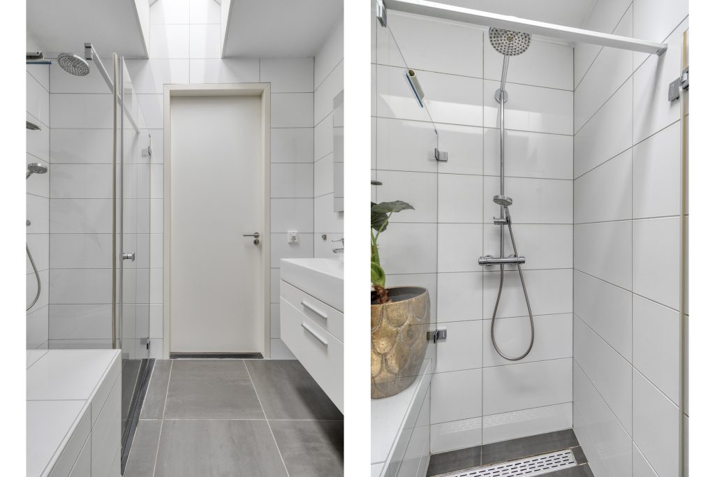 De moderne badkamer is geheel betegeld en voorzien van een elektrische lichtkoepel, hoekbad, aparte douchecabine met regen- en handdouche, zwevend toilet, dubbele wastafel met meubel, spiegel met verlichting en handdoekradiator.