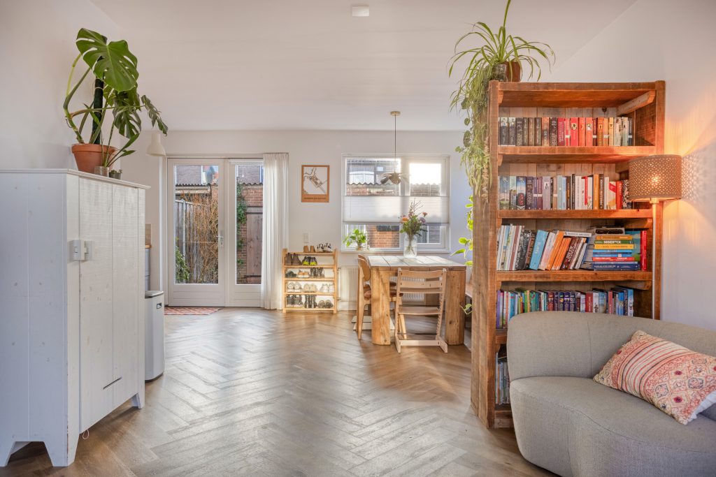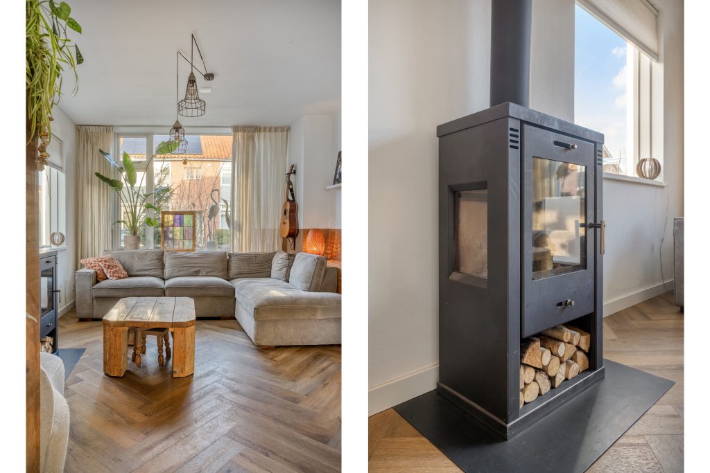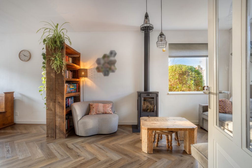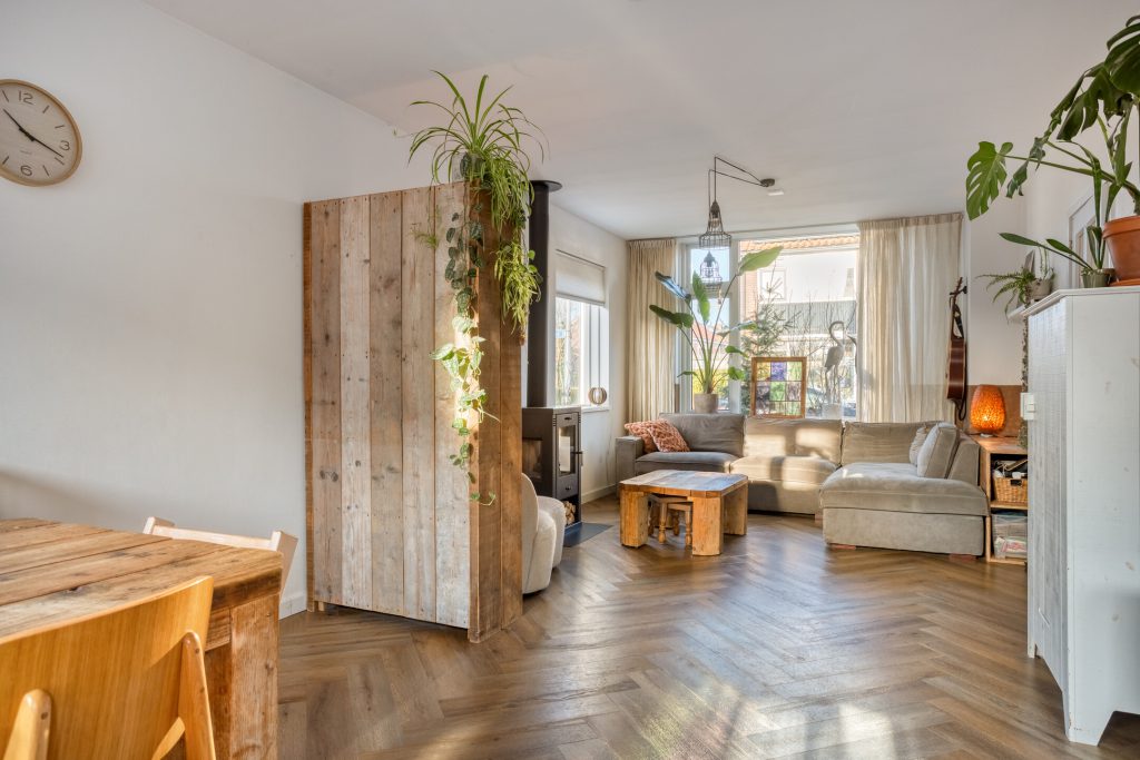 De lichte en ruime woonkamer is afgewerkt met een pvc-vloer, een gestuct plafond en glasvlies wanden. De houtkachel zorgt voor extra warmte en sfeer. Op de begane grond zijn screens aanwezig, m.u.v. de deuren. De woonkamer staat in open verbinding met de keuken, die is geplaatst in de aanbouw uit 2015.