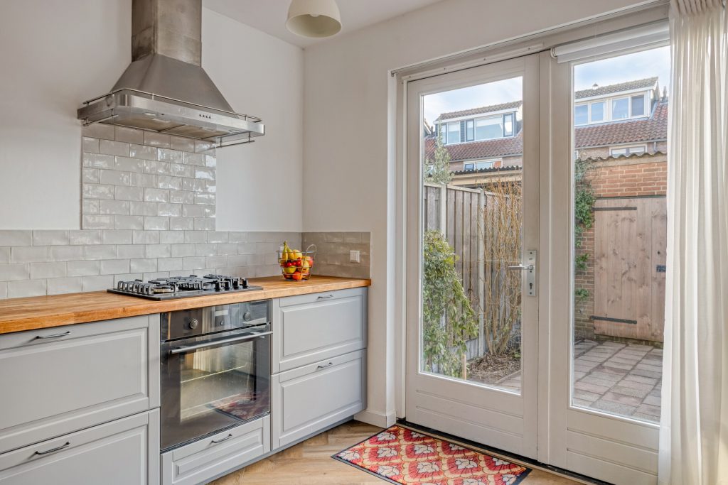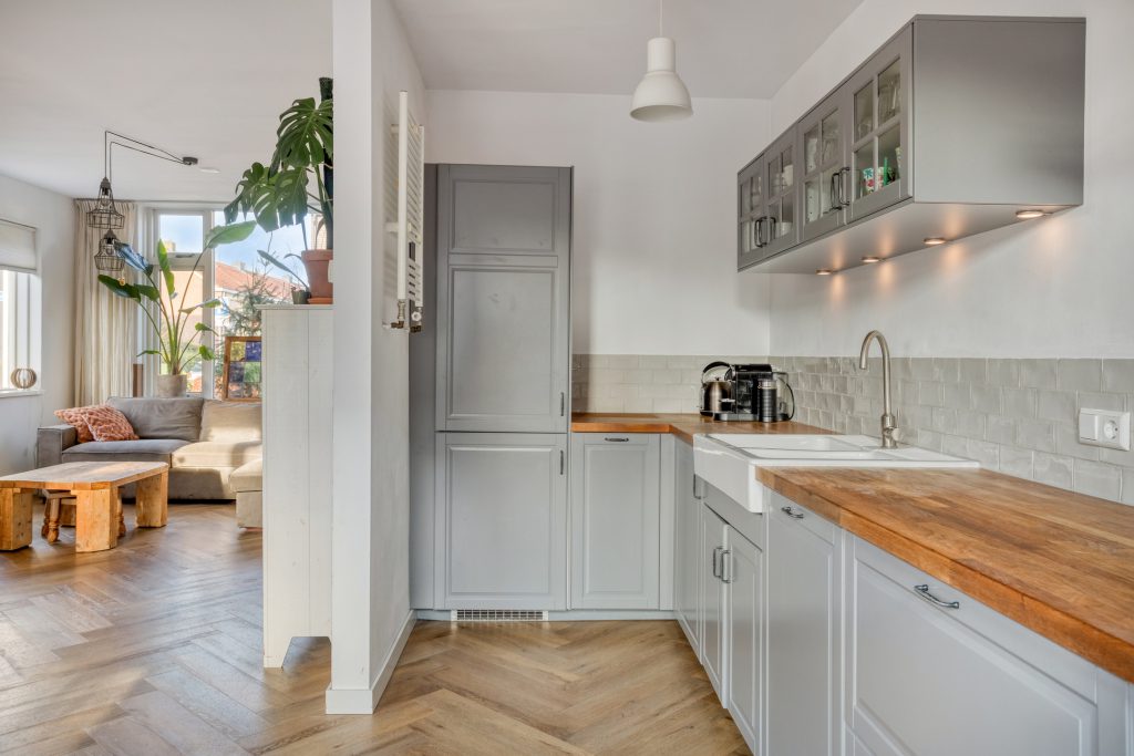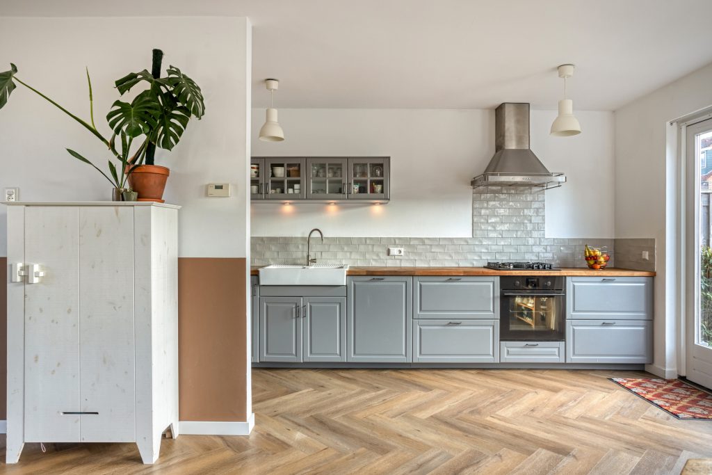 De open keuken is praktisch ingericht en voorzien van diverse inbouwapparatuur, waaronder een vierpits gaskookplaat, afzuigkap, vaatwasser, oven en een koel- en vriescombinatie. Daarnaast beschikt de keuken over pannenladen en een dubbele spoelbak, wat zorgt voor voldoende werk- en bergruimte.