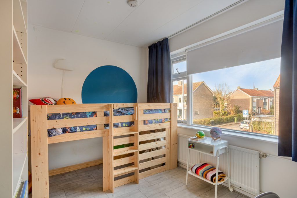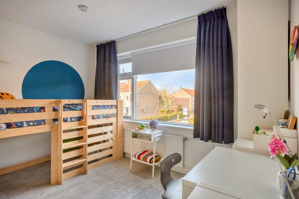 Op de eerste verdieping bevinden zich drie slaapkamers en de badkamer. De overloop en slaapkamers zijn afgewerkt met een laminaatvloer. De slaapkamer aan de voorzijde beschikt over een elektrisch screen. Een tweede slaapkamer is voorzien van een schuifdeurenkastenwand en de derde slaapkamer is geschikt als kinder-, werk- of hobbykamer. De badkamer is ingericht met een douche(bak), een wastafel met meubel en een spiegelkast.