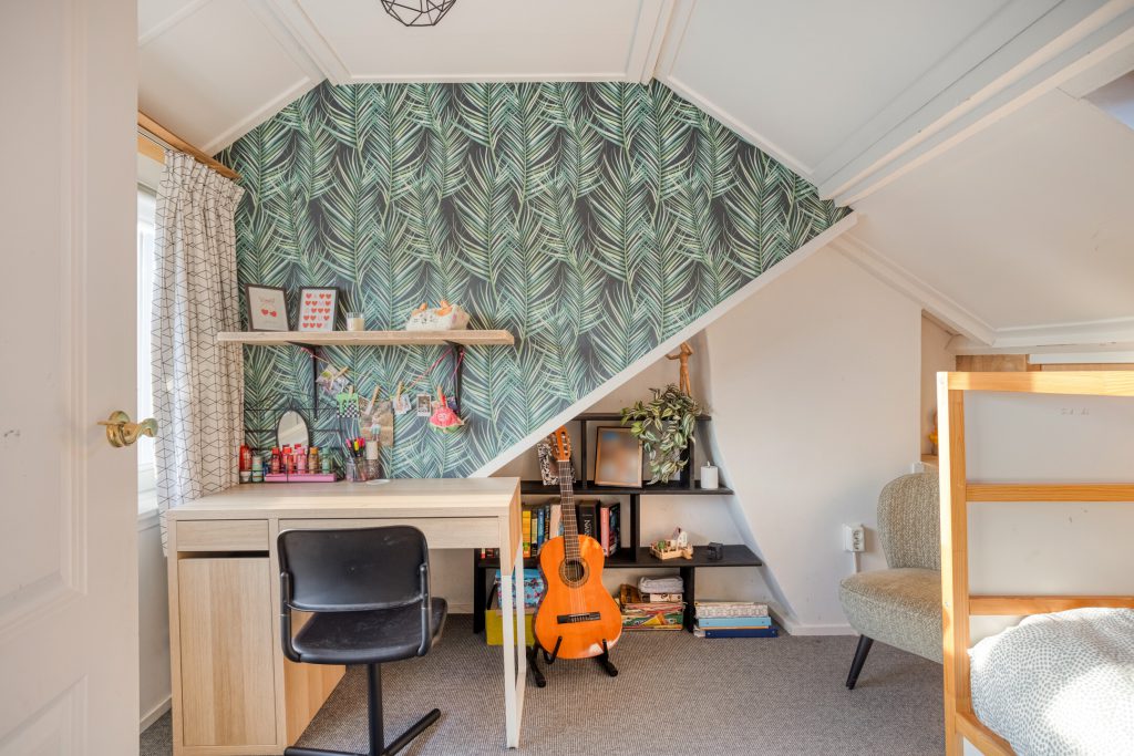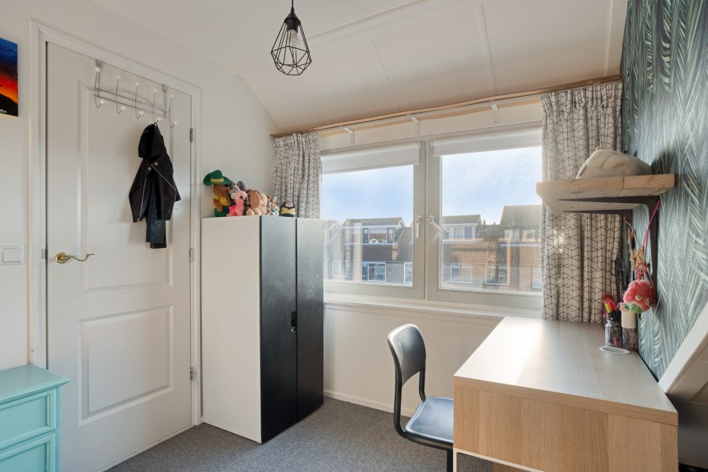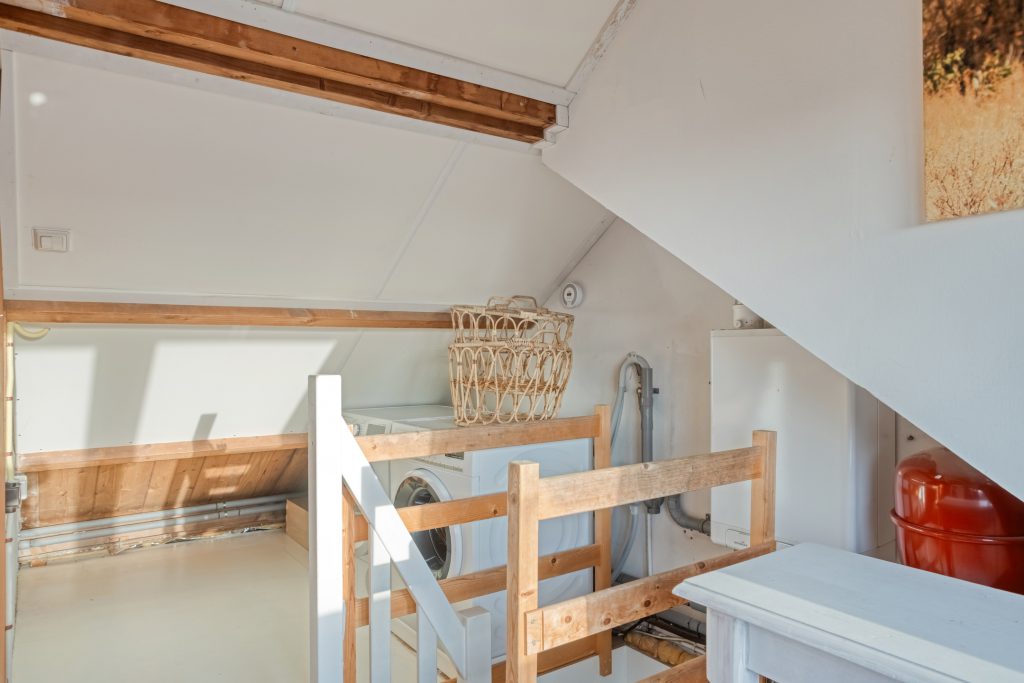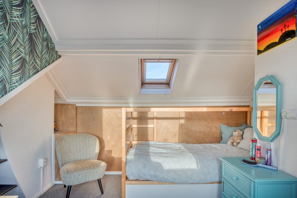 De tweede verdieping is bereikbaar via een vaste trap en is door de dakopbouw uit 2015 ruim en functioneel ingedeeld. Hier bevindt zich een vierde slaapkamer met tapijtvloer, een dakraam en knieschotten voor extra bergruimte. Tevens zijn op de ruime overloop de aansluitingen voor de wasmachine en droger aanwezig, evenals de cv-combiketel.