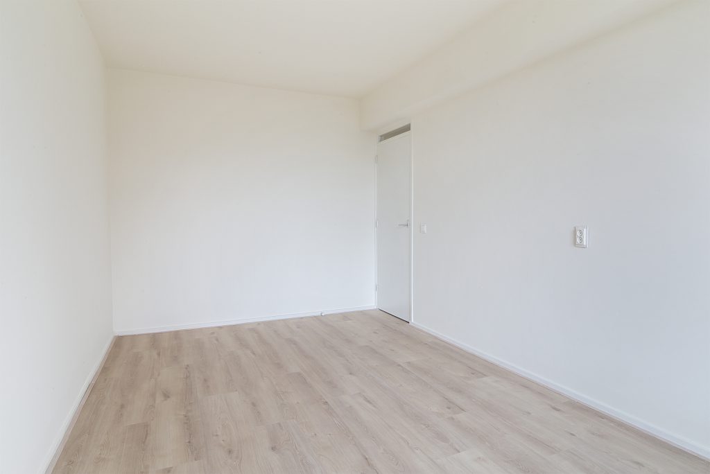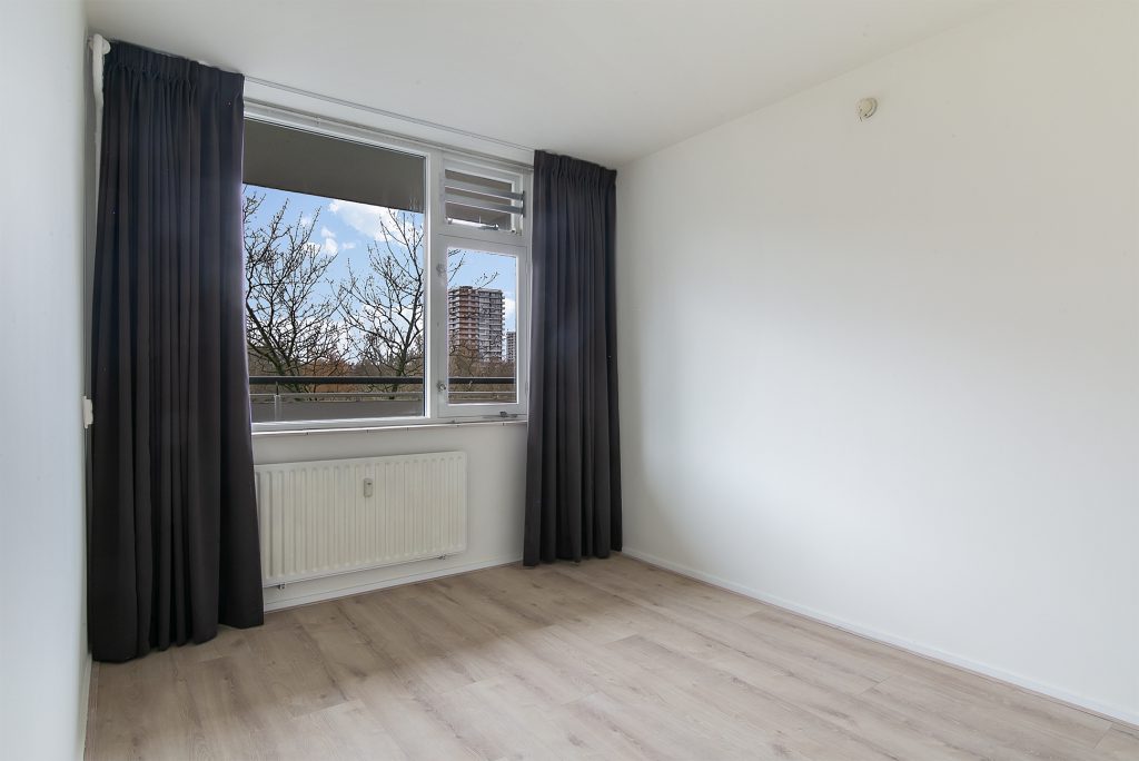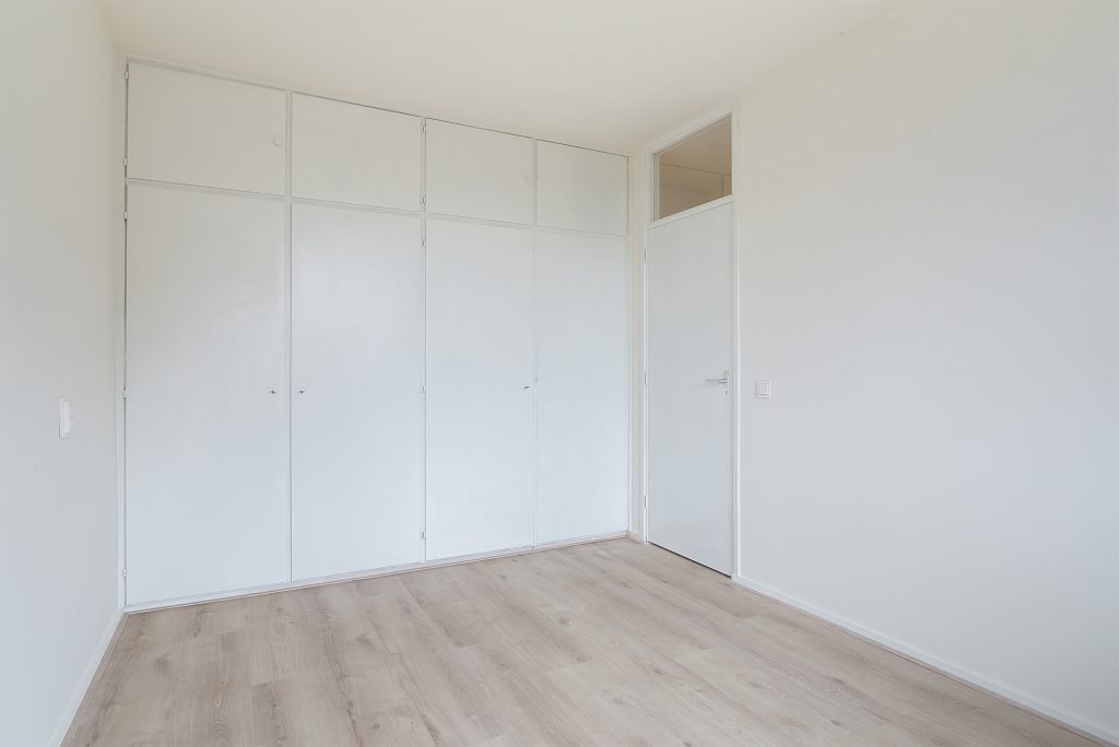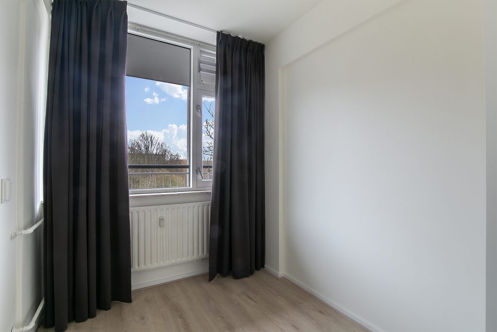 Het appartement beschikt over maar liefst drie slaapkamers, allen netjes afgewerkt met laminaatvloeren, stucwerkwanden en raamdecoratie. De slaapkamer aan de voorzijde is voorzien van praktische inbouwkasten, waardoor er voldoende opbergruimte beschikbaar is.