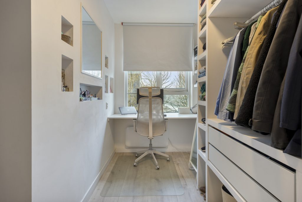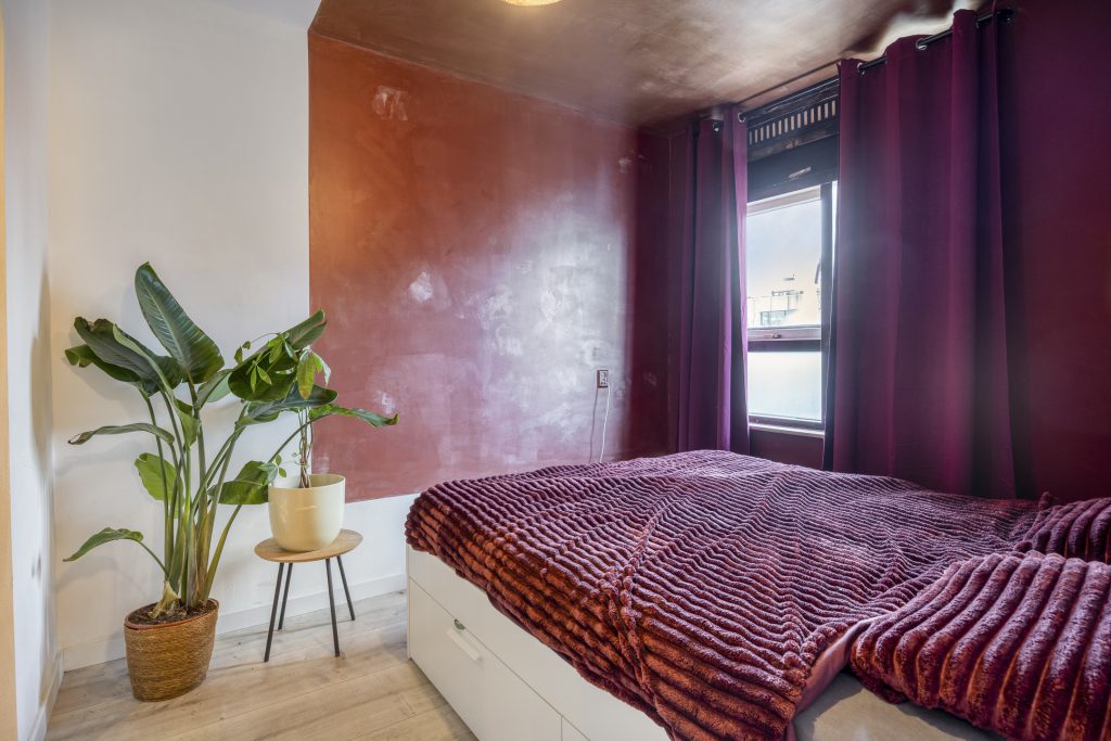 De entree van de woning bevindt zich op de vierde verdieping. In de hal treft u een trapkast en de meterkast (voorzien van 12 groepen en 3 aardlekschakelaars). De royale slaapkamer is momenteel ingericht als een slaap- en werkgedeelte. De aanwezige nisjes en ruime inbouwkast zorgen voor een efficiënte indeling.
