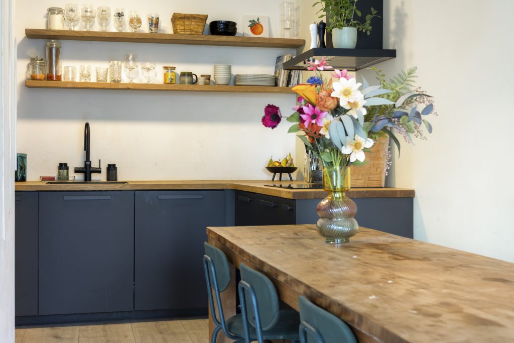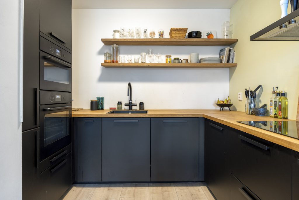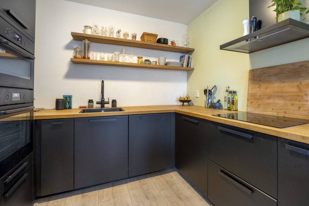 De halfopen keuken heeft een modern design en is compleet uitgerust met diverse inbouwapparatuur, waaronder een inductiekookplaat, afzuigkap, vaatwasser, oven en combi-oven, koel-vriescombinatie, kokend waterkraan met waterfilter en een praktische apothekerskast. De houten planken geven de keuken een moderne en functionele uitstraling.