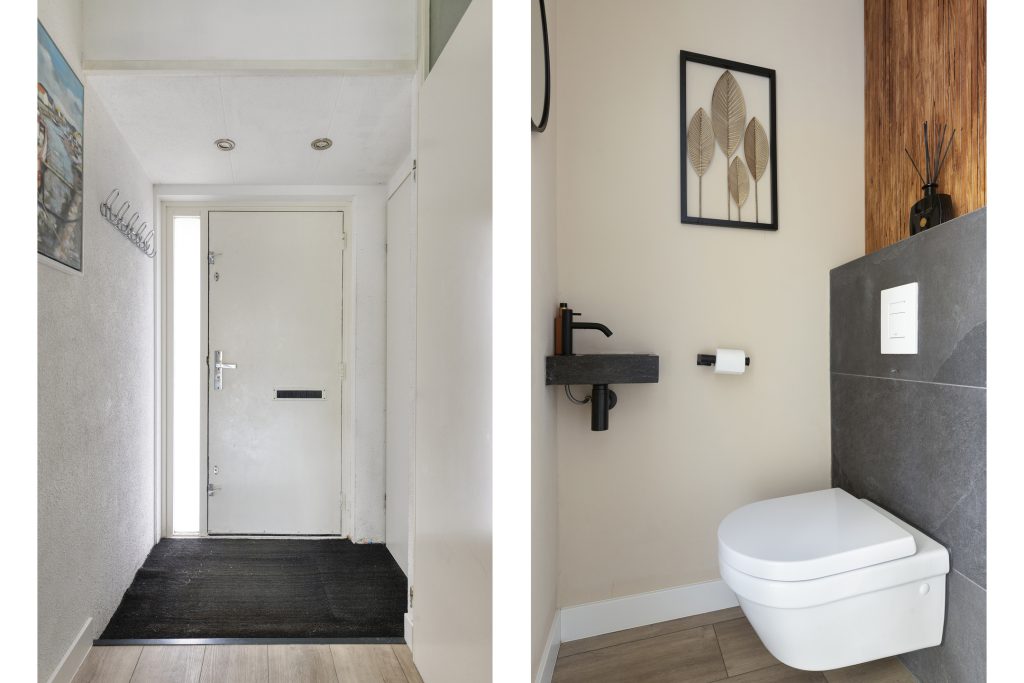 Bij binnenkomst wordt u ontvangen in een nette hal, die toegang verleend tot het toilet met fonteintje (2022) en een meterkast voorzien van twee aardlekschakelaars en zeven groepen.