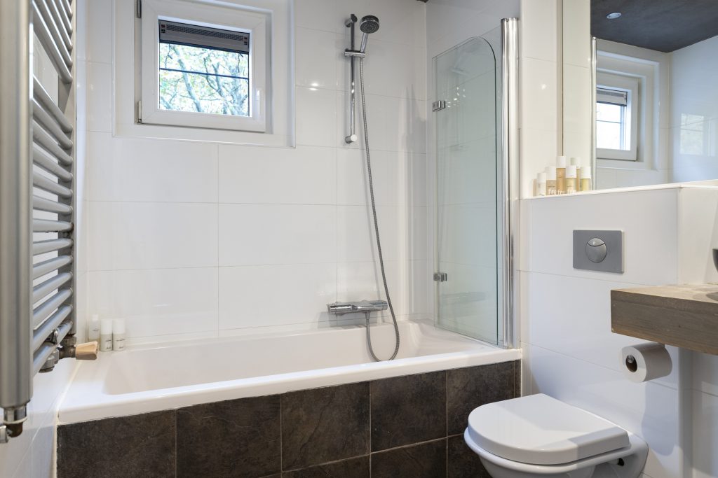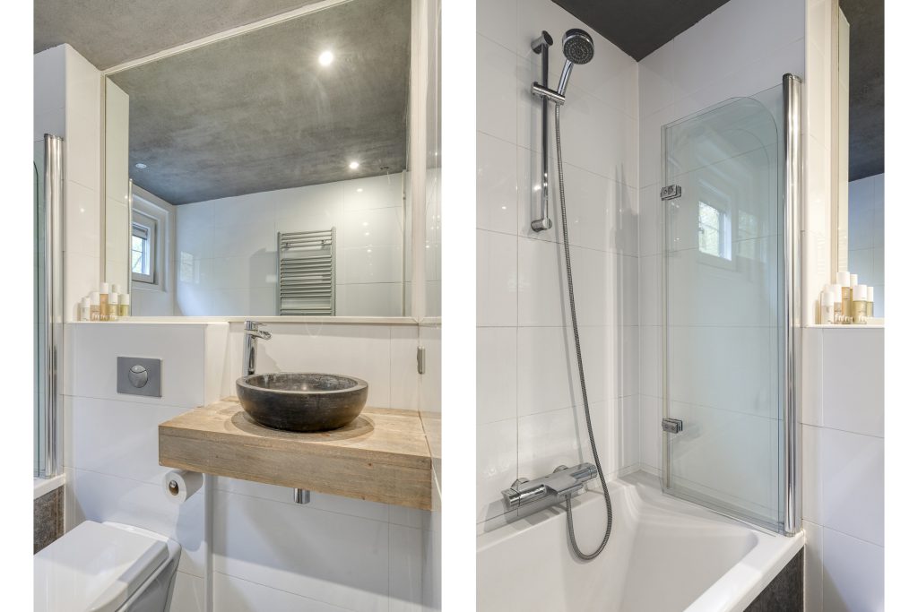 De badkamer is keurig onderhouden en biedt u alle comfort, een ligbad met handdouche en spatscherm, designradiator, meubel met waskom en een tweede toilet.