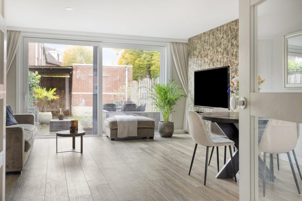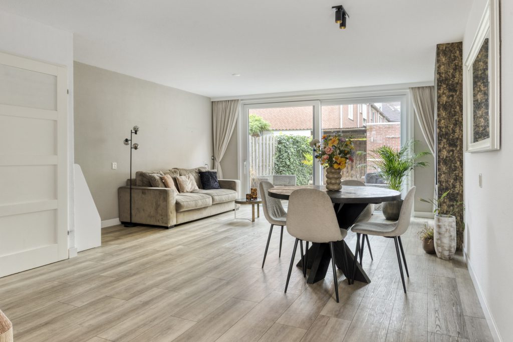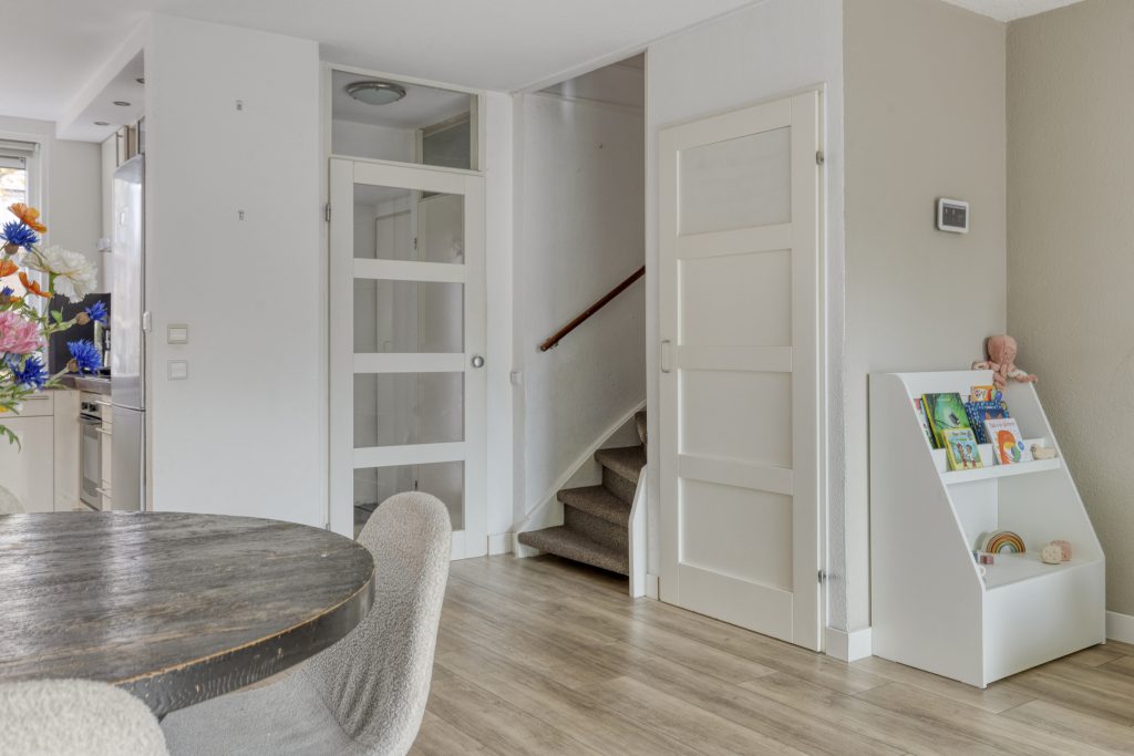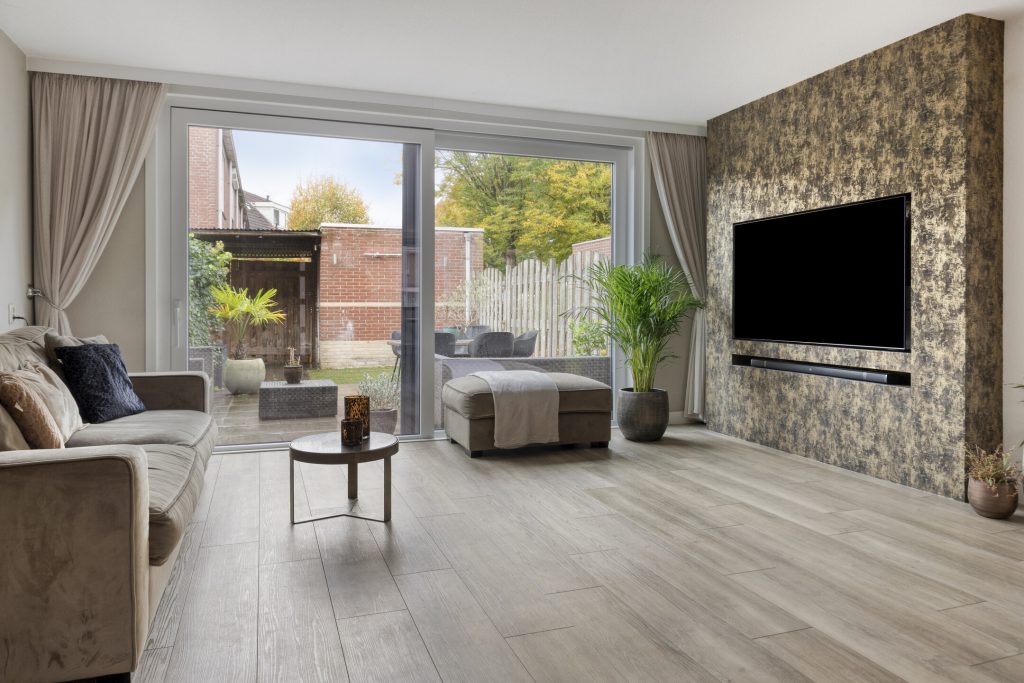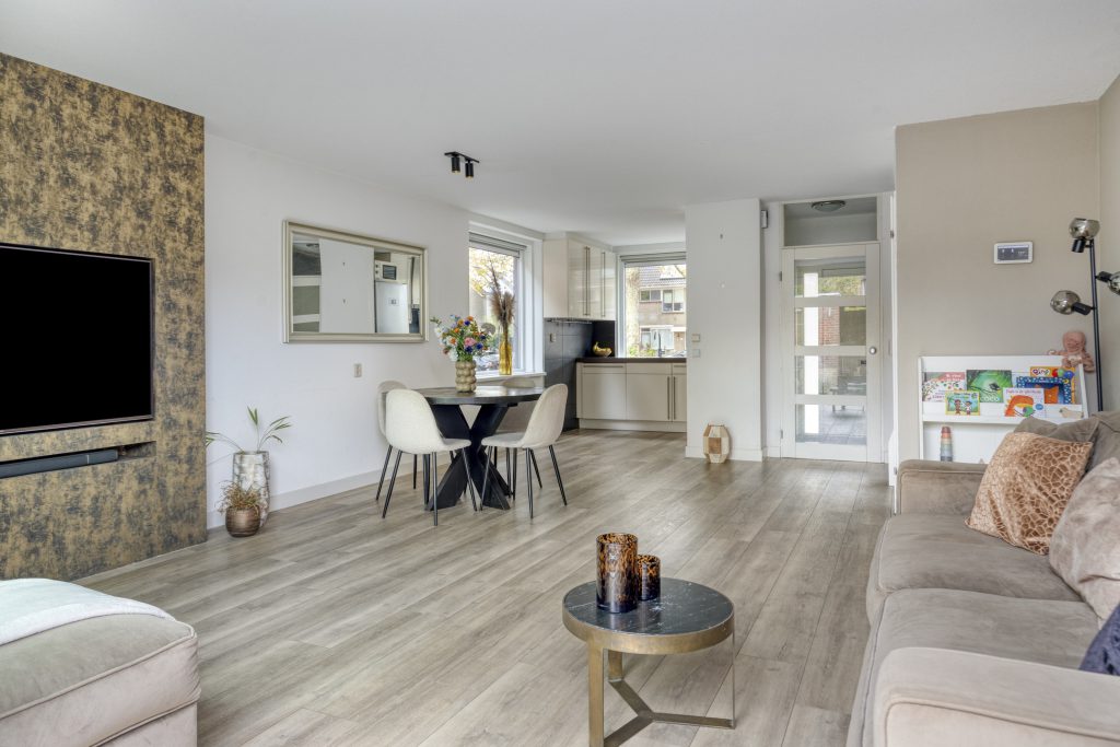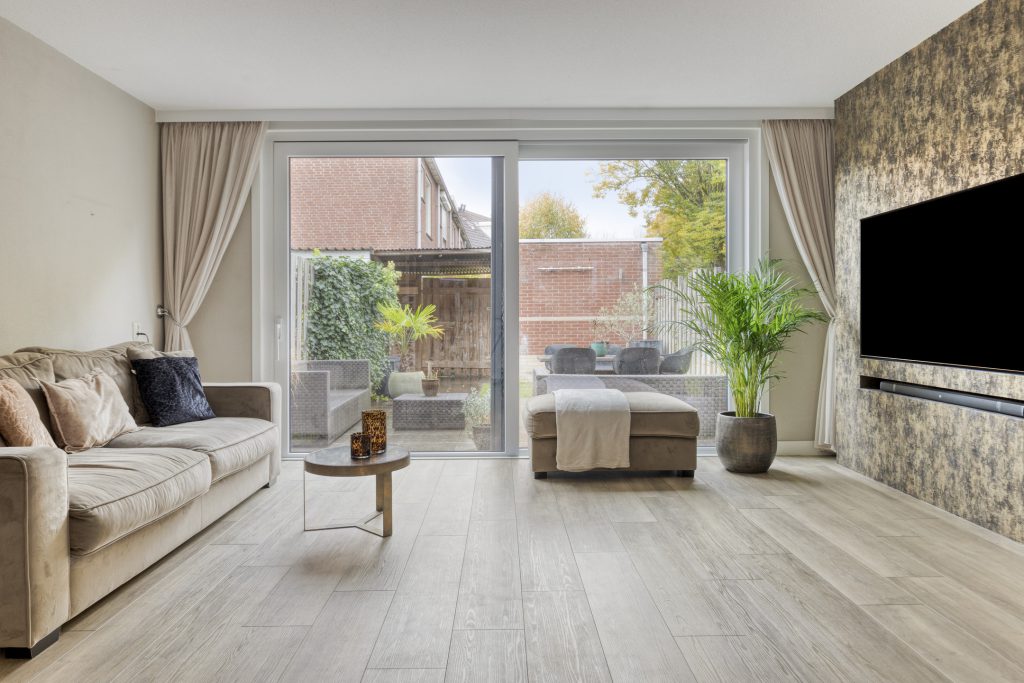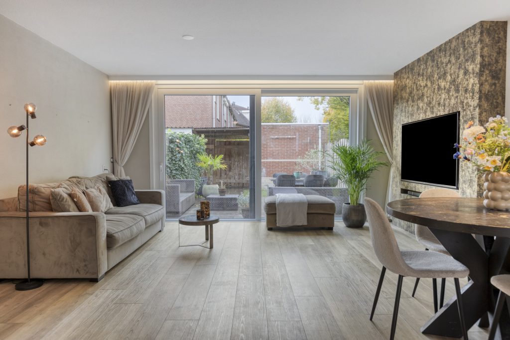 De woonkamer straalt warmte en ruimte uit, mede dankzij de fraaie PVC-vloer met vloerverwarming, de spachtelputz-wandafwerking en de grote schuifpui die zorgt voor veel lichtinval en directe toegang tot de tuin. Daarnaast biedt de praktische trapkast volop opbergruimte, terwijl de cinema wall een echte blikvanger vormt in deze ruimte.