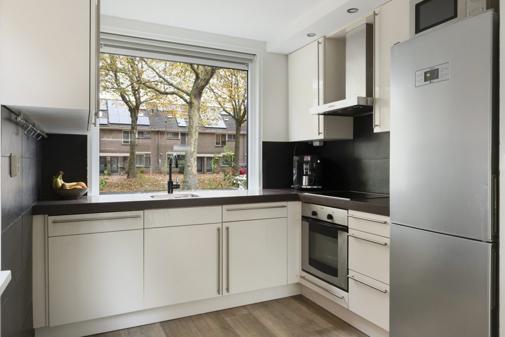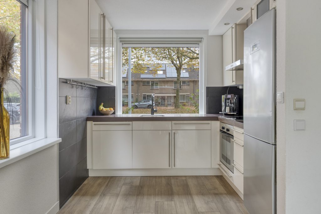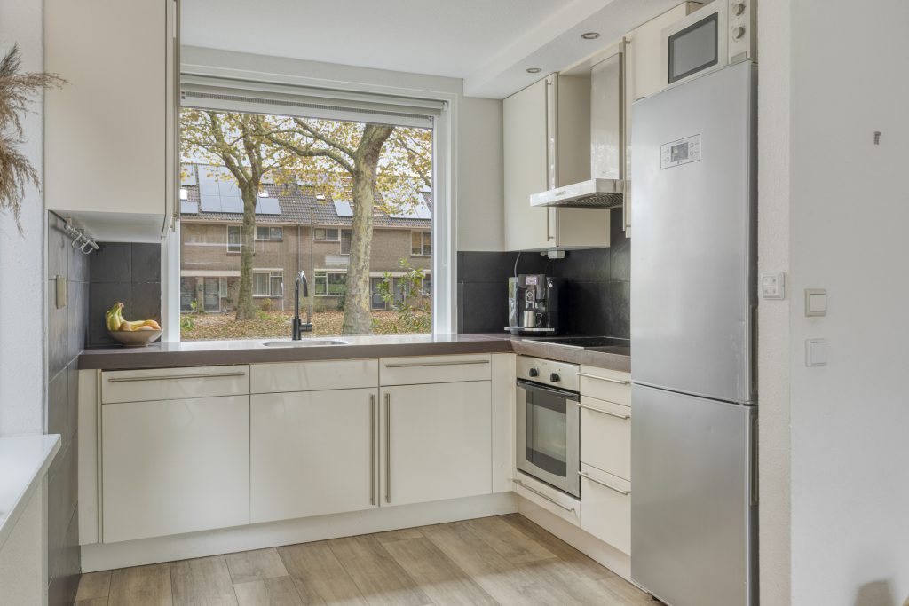 De keuken is modern uitgerust met diverse inbouwapparatuur, zoals een koel-/vriescombinatie, afzuigkap, vaatwasser en oven.