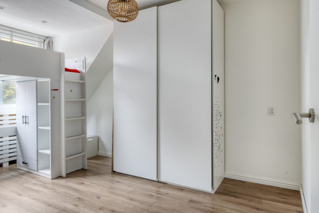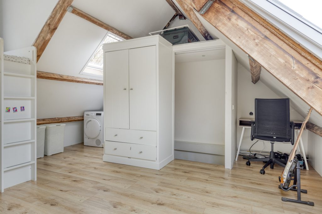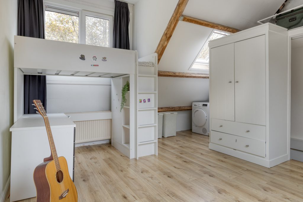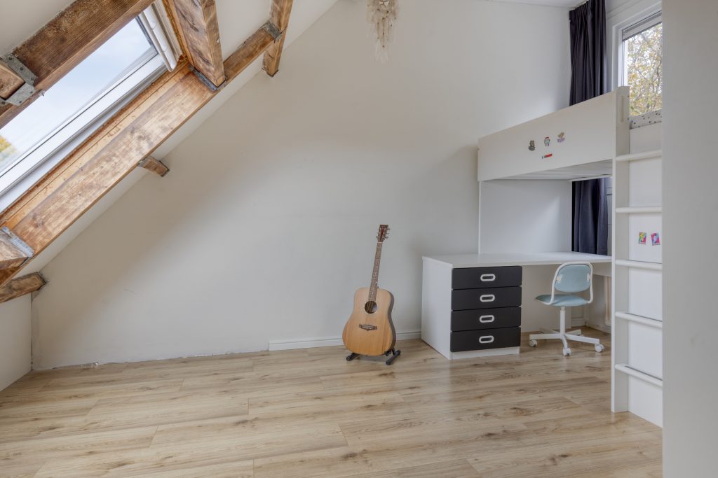De tweede verdieping is verrassend ruim en biedt een open zolder met laminaatvloer, wasmachine- en drogeraansluiting, mechanische ventilatie-unit en een praktische schuifdeur. Deze ruime zolder is ideaal als extra slaapkamer, werkruimte of hobbykamer.